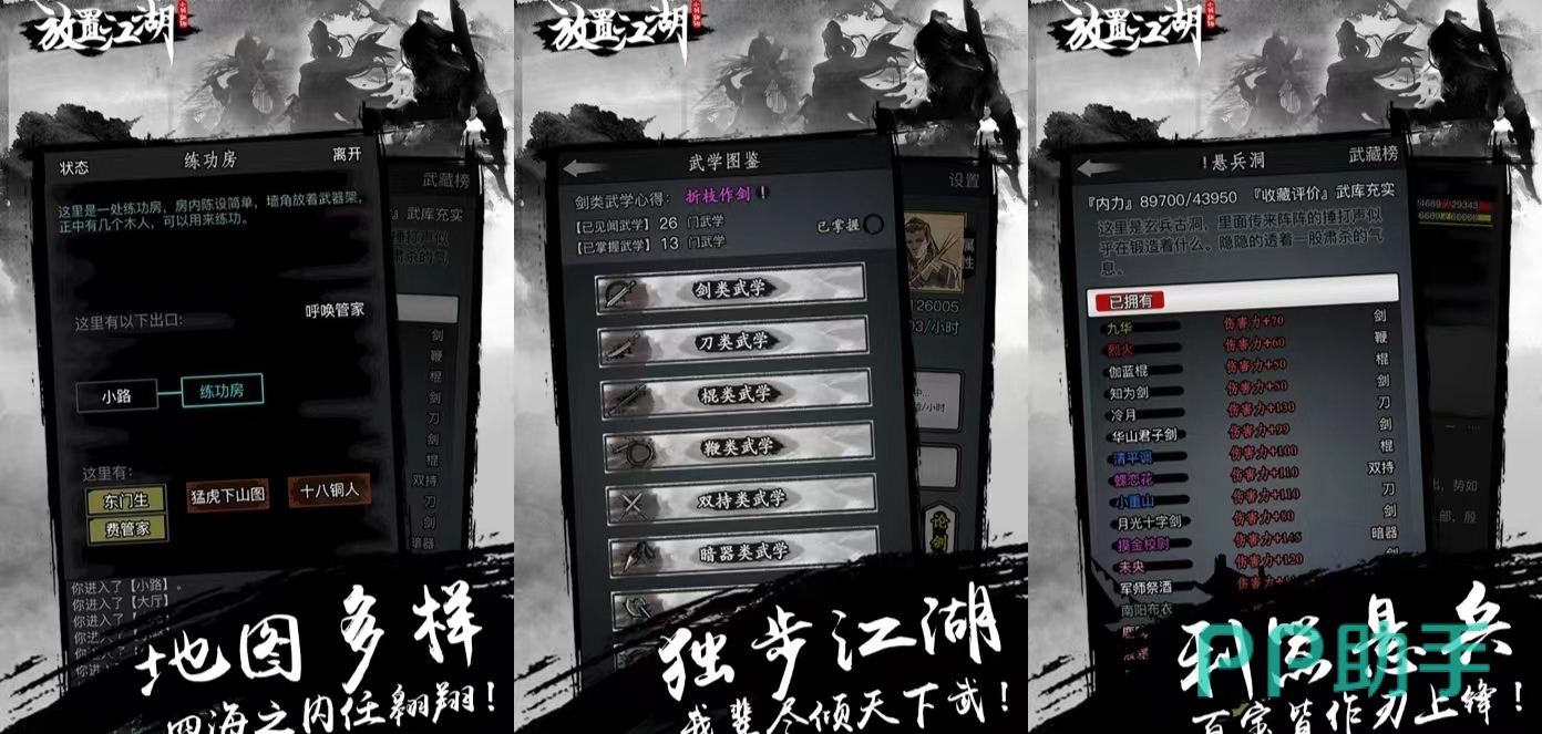 《放置江湖》这里有大量的文字来讲述武侠,在这个游戏中玩家可以看到有不同的门派,在地图中也会有看到很多江湖上的场景。也加入了很多江湖气息的系统,游戏中含有大量的丰富剧情。游戏中玩家可以学习武功就有上百种,在游戏中玩家如果把NPC角色不小心杀掉了,也要小心角色可能会来万家这里寻仇,玩家也可以体验到招募门客,访问好友等内容。