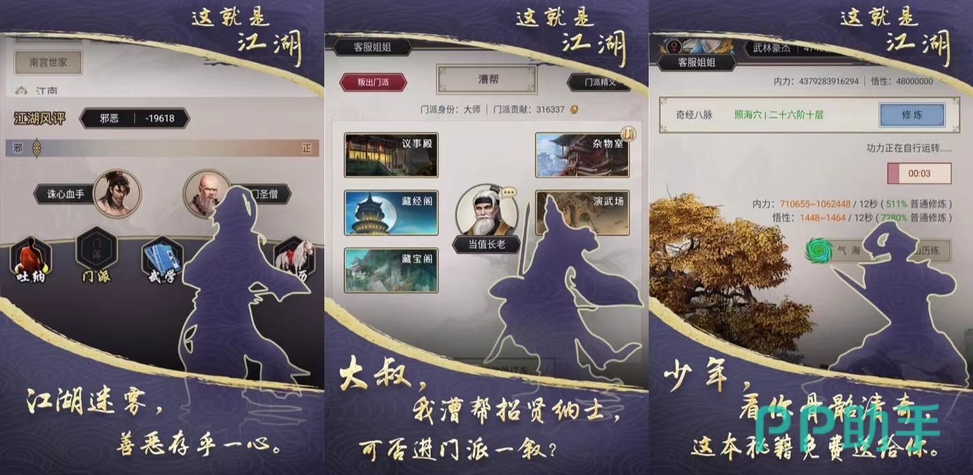 《江湖人生》玩家扮演的角色会出身自江湖中,在游戏中通过完成任务,然后可以体验到很多不同的江湖感受。游戏中有一个非常开放的世界,可以给玩家自由的探索,可以和游戏中的任意NPC进行对话和互动。游戏中也可以成为江湖上很多的不同职业,比如成为一个商业巨头或者是艺术家都有可能。游戏的挂机内容玩家不在线的时候也可以进行修炼。