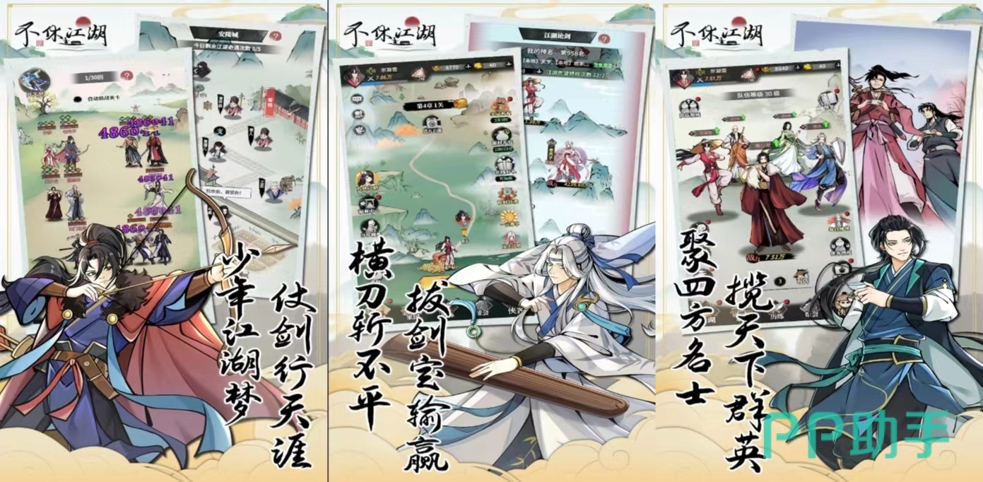 《不休江湖》这款游戏里面设计了很多个奇特的NPC江湖角色。玩家在开局会得到一位角色,在后续可以通过招募来得到更加厉害的角色。在作战的时候也可以有好几名成员共同出战,在游戏中一共有五大掌门可以划分,这款游戏也比较适合用来摸鱼,除了玩法上新奇以外,自由度是非常的高的。玩家可以把这里打造一个自己心中的江湖。