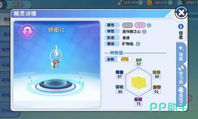 要是圈在游戏里的数值总和虽然只有470,但是好在各方面的能力都是比较均衡的,不管攻击防御还是特攻属性虽然都不高,但是也绝对是可以在战斗过程中起到相应作用的,假如玩家可以不断提升钥匙圈,让他进行进化的话,那就能收到一个超级钥匙圈,升级之后,钥匙圈的防御能力相对来说会变得更强一些。