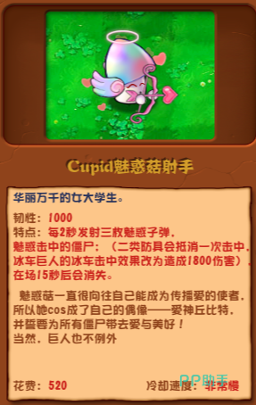 她原本是个长得特别漂亮和气质也特别好的女大学生,不只是脸蛋漂亮,身材好,更重要的是她内心也特别强大,不是那种娇滴滴的小姑娘。这姑娘心里有个愿望,就是特别想成为一个能传递爱的使者,为了这个梦想,她甚至还把自己打扮成偶像爱神丘比特的样子。在战场上这姑娘也是不含糊,总是满怀爱和希望,勇敢地站在前线。她的存在真的给那些植物们带来了很大的帮助,大家也会更有信心去面对那些可怕的僵尸。