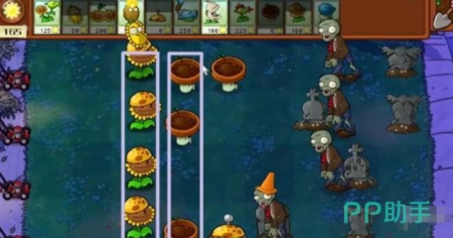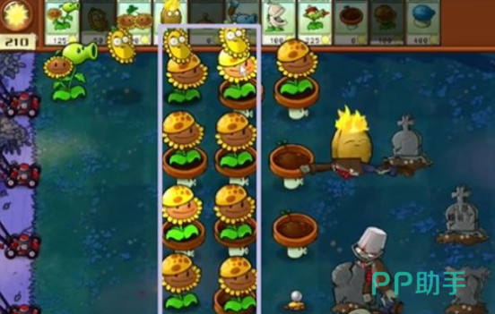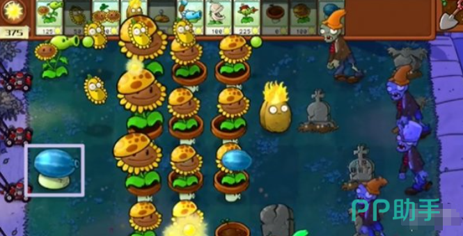 所以,这是大家可以迅速种两排阳光向日葵,还在同样的地方叠了些小盆菇。这小盆菇真的是个宝贝,不仅免费,还能叠加种植,输出也很给力,多种点绝对没错。还可以在墓碑旁边放火炬坚果和土豆雷,这样防御就更稳固了,到了第二波就开始布局攻击了,种了一列的冰瓜大喷菇和大蒜花,准备迎战。