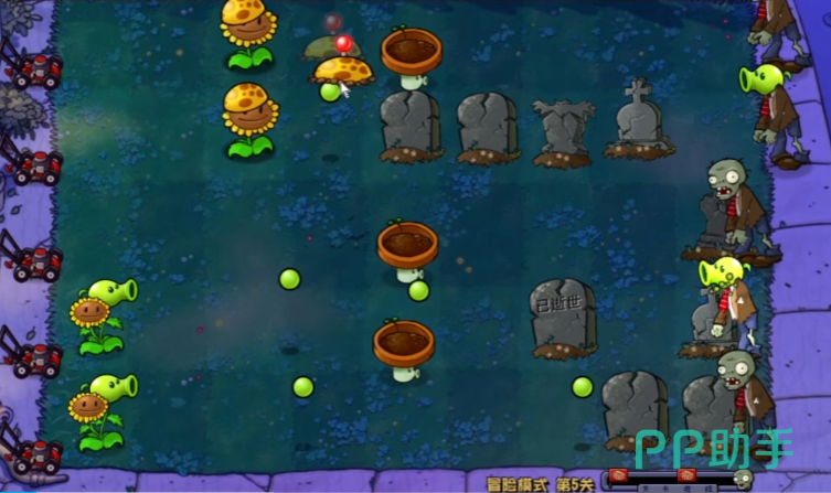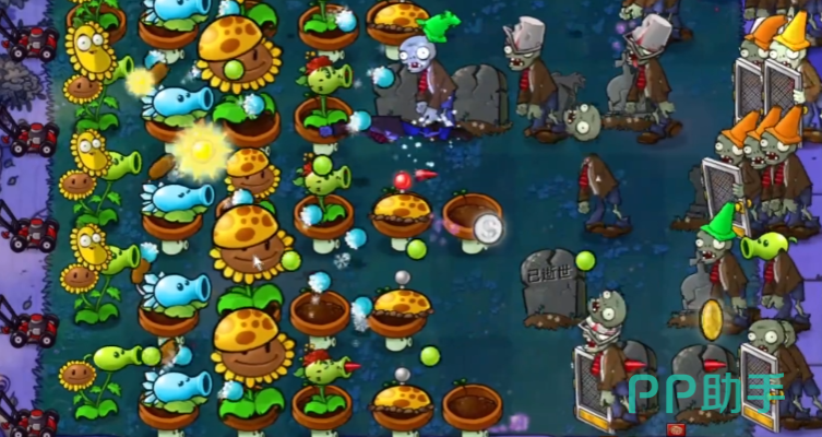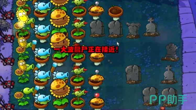 在这个关卡里面,大家要对付的是水里和陆地上的僵尸。游戏开始后,僵尸们会陆陆续续地冒出来,玩家需要开始摆放植物卡片来防御他们。当大家摆放到一定程度时,游戏会提醒我们有一大堆僵尸要来了。这时候就必须要继续摆放卡片,做好防御准备,然后打败所有冲过来的僵尸。