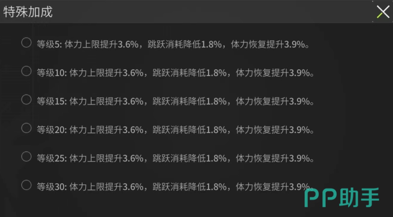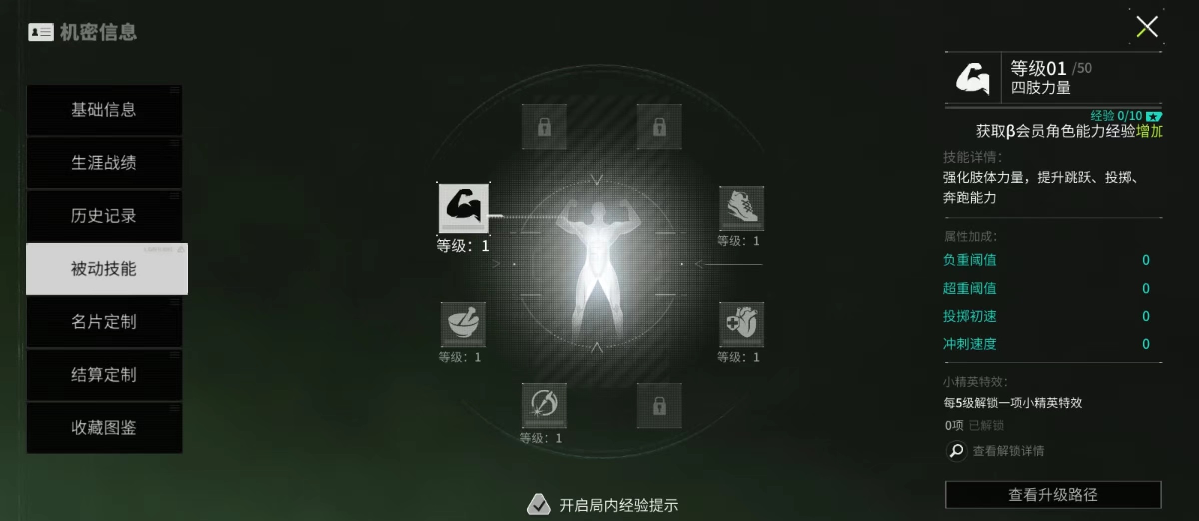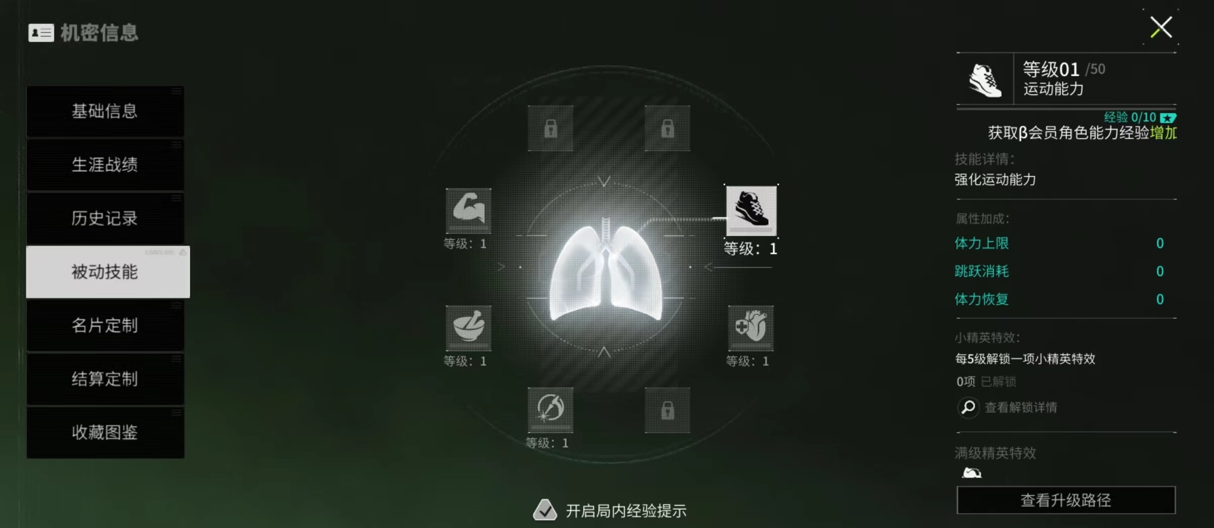 如果想要提高上限或者是提高恢复的速度,那就需要用到被动技能,点击人物头像,从中选择被动技能后,可以看到有多种不同的选项。包括四肢力量,营养代谢,运动能力和身体抗性等。选择运动能力就可以看到,当前主要提升的就是体力上限,跳跃消耗和体力恢复。通过提升运动能力等级,这些属性都能获得加强,当达到50级时将会解锁精英特效。带来的特殊加成就是体力上限提升,跳跃消耗降低和体力恢复提升。