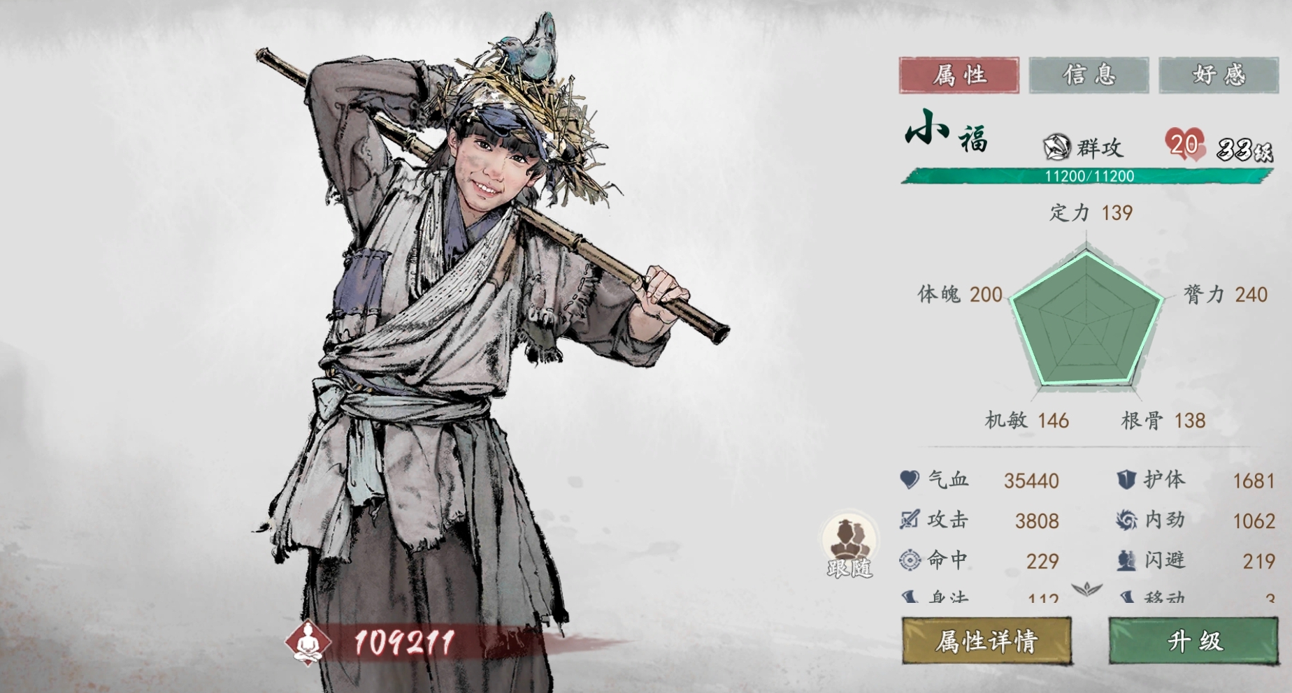 不同流派加点侧重点也不一样,刀剑加臂力,棍/拳掌加体魄,部分内劲功法加定力(招式描述中带内劲二字,则需要加定力)。在起步阶段完全不用加机敏,到后期再说。一次升级3点,分配建议为: