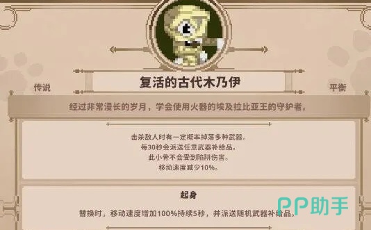 作为游戏中的头骨之一,他的能力还是非常不错的,拥有非常高的攻击频率和伤害值,木乃伊传说,这个头骨是唯一一个没有进化外观变化,只有武器变化的头骨,他拥有两种流派,第一个是平a固伤的特效,强度非常高,而且还拥有魔攻CD,可以召唤虫子,另一个玩法的强度不如第一种的强度高,但是他非常吃道具,在这个投入中,拥有非常多武器的补给,比如喷火枪,它拥有非常高的攻击频率,还有霞弹,激光炮等等,高额的伤害。