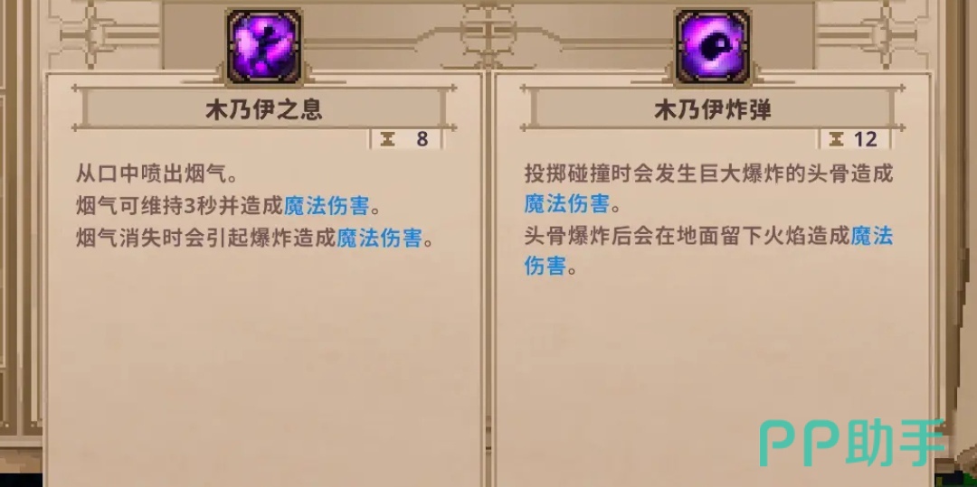 头骨的这个技能不能吃到这个武器的增幅还有魔剑这个道具也不太适合这个头部来选择,大家可以根据面板道具来进行选择,木乃伊这个头部是游戏中攻击频率最高的,并且也很适合来放火,攻击的效果也非常稳定。