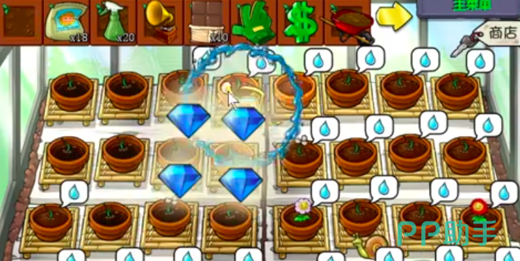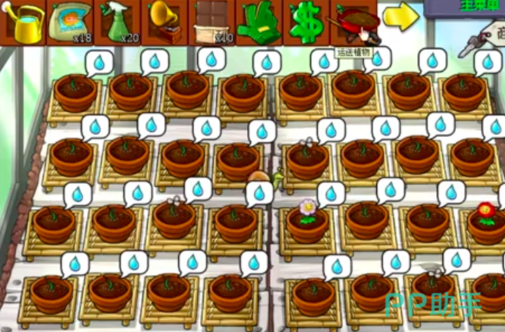 接下来在种子上方会显示一个水滴样图案,此时玩家就可以选择黄金水壶来为这些种子进行灌溉浇水,每一次成功浇水后都可以让玩家获得一定数额的金币,利用这些金币又可以购买到新的种子或者是一些更高级的塔防装备,当然除了浇水,玩家还可以利用杀虫剂施肥给这些种子听歌,不过也要看这些种子的需要了,如果这些种子有具体需要,都会在上方的白色框框当中,直接进行显示。