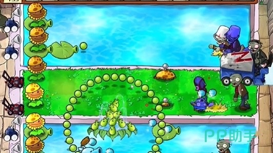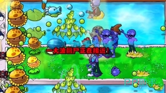 随着游戏的进行,僵尸的数量和种类会越来越多,这时候就需要我们灵活应变,及时补充兵力了。在上方泳池里继续补充豌豆许愿池和寒冰香蒲,形成双重保险,彻底封锁水路!在中间草坪上,种上冰冻西瓜大喷菇,利用它的溅射伤害,有效清理大波僵尸。