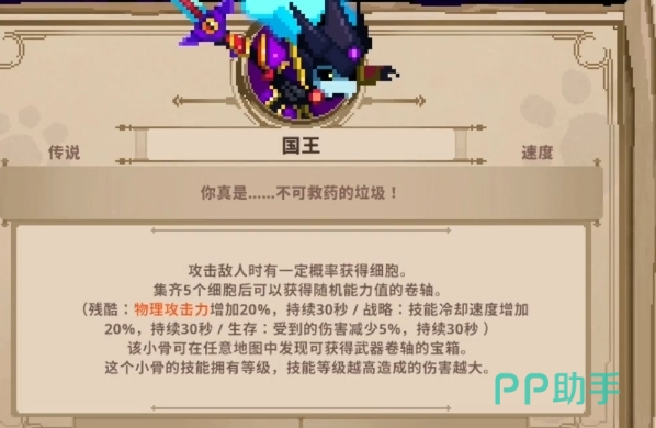 首先需要理解国王自带的技能,之后才能给它装配更适合的精华,道具和黑暗技能,它的技能效果是集齐五个细胞后可以获得随机能力值的卷轴,残酷卷轴可以提升20%攻击力,战略卷轴可以加快技能20%冷却速度,生存卷轴则是减少5%伤害。