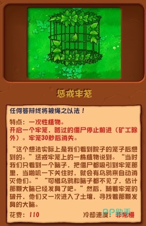 而且,惩戒牢笼的花费并不高,只需要110点阳光就能召唤出来,性价比非常高。不过,它的冷却时间比较长,所以要谨慎使用,最好等到关键时刻再使用,才能发挥出它最大的作用。