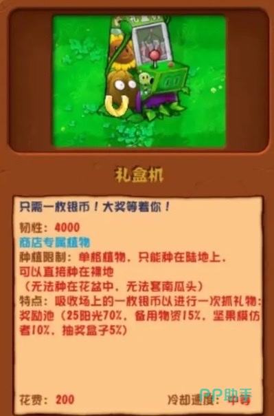 总而言之,礼盒机就是一个集惊喜和趣味于一体的特殊植物,它虽然不能直接帮你打僵尸,但却能为你提供各种战斗资源,让你在战斗中更加游刃有余。如果你也想要体验一把开盲盒的乐趣,那就赶紧去商店里寻找这个神奇的植物吧,好了本期植物大战僵尸杂交版礼盒机怎么样就到这里了。