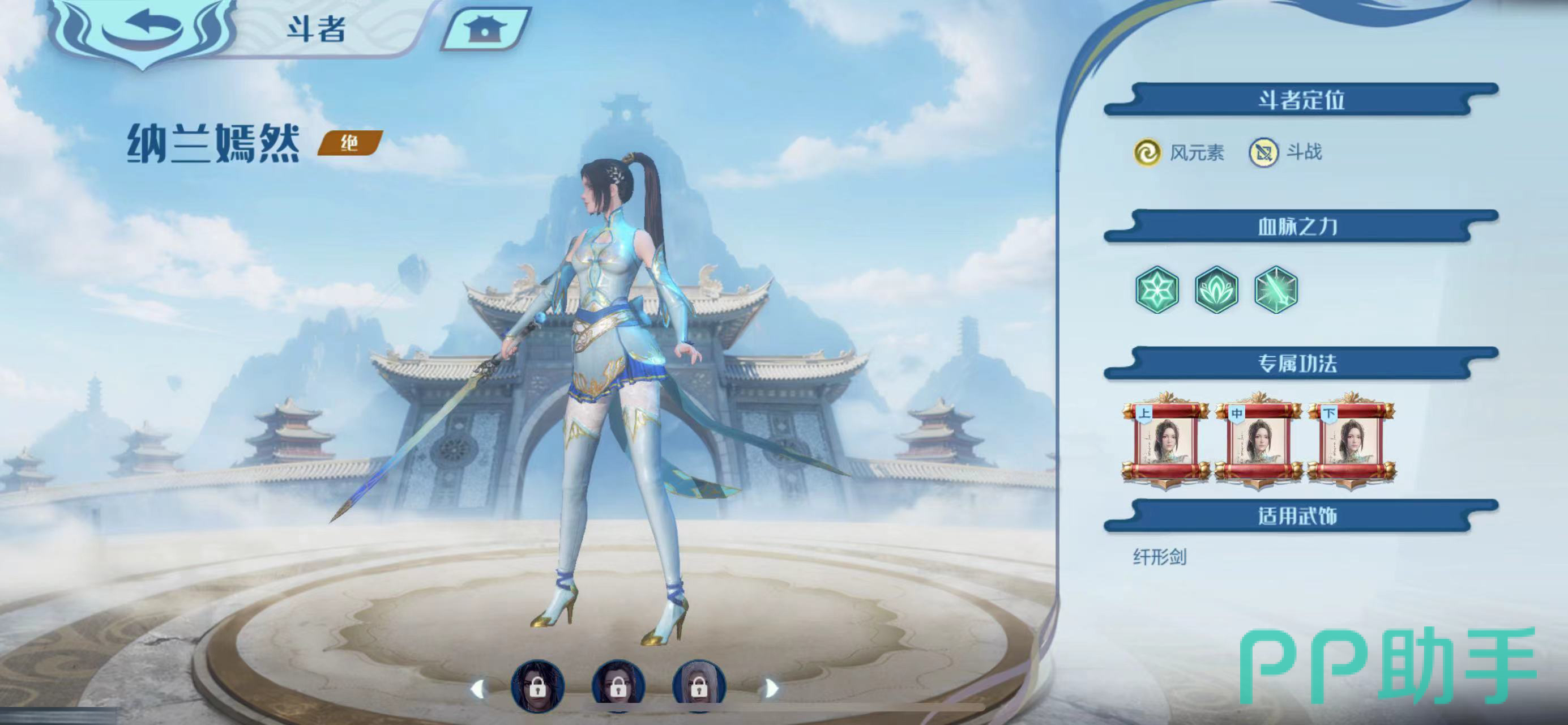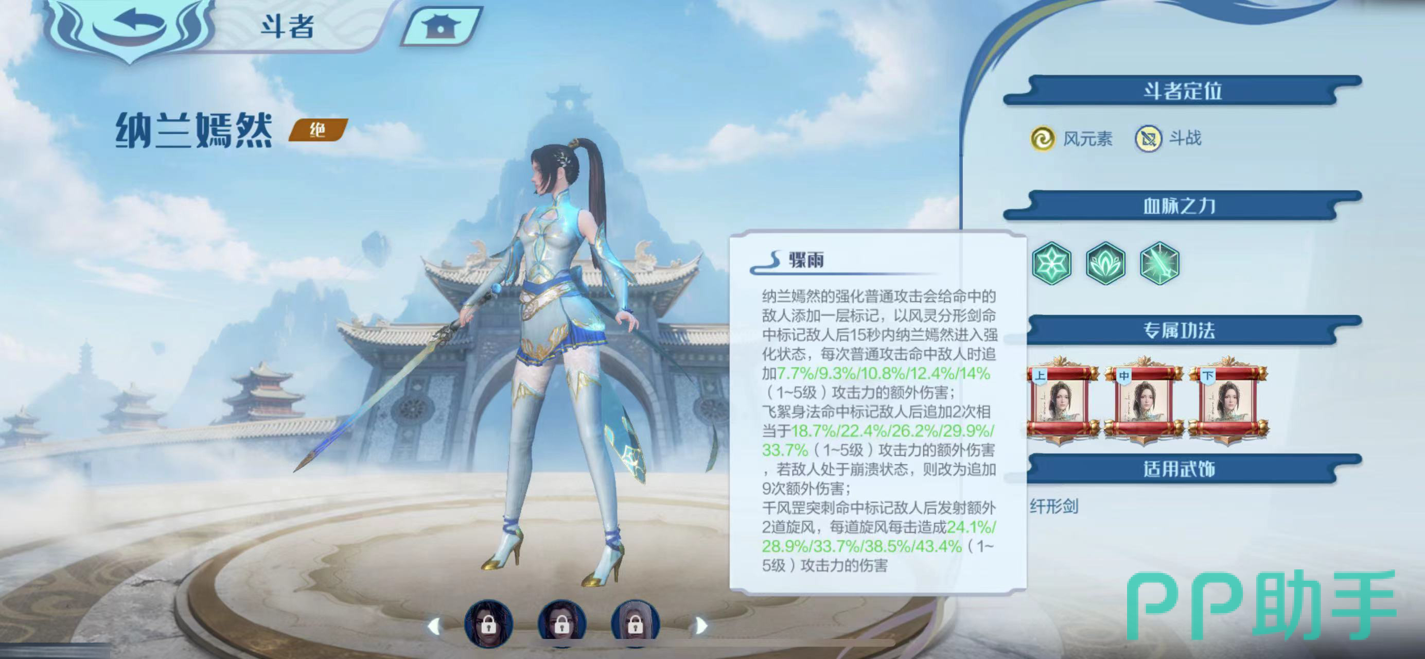 纳兰嫣然的定位是斗战,并且作为一个橙色英雄。拥有良好的成长属性,主要攻击手段为风属性技能。此外她的外貌非常优雅美丽,有着英姿飒爽的身姿以及高挑的身材。就算在战斗中,也能欣赏她美丽的形象,让人心中无比愉悦。