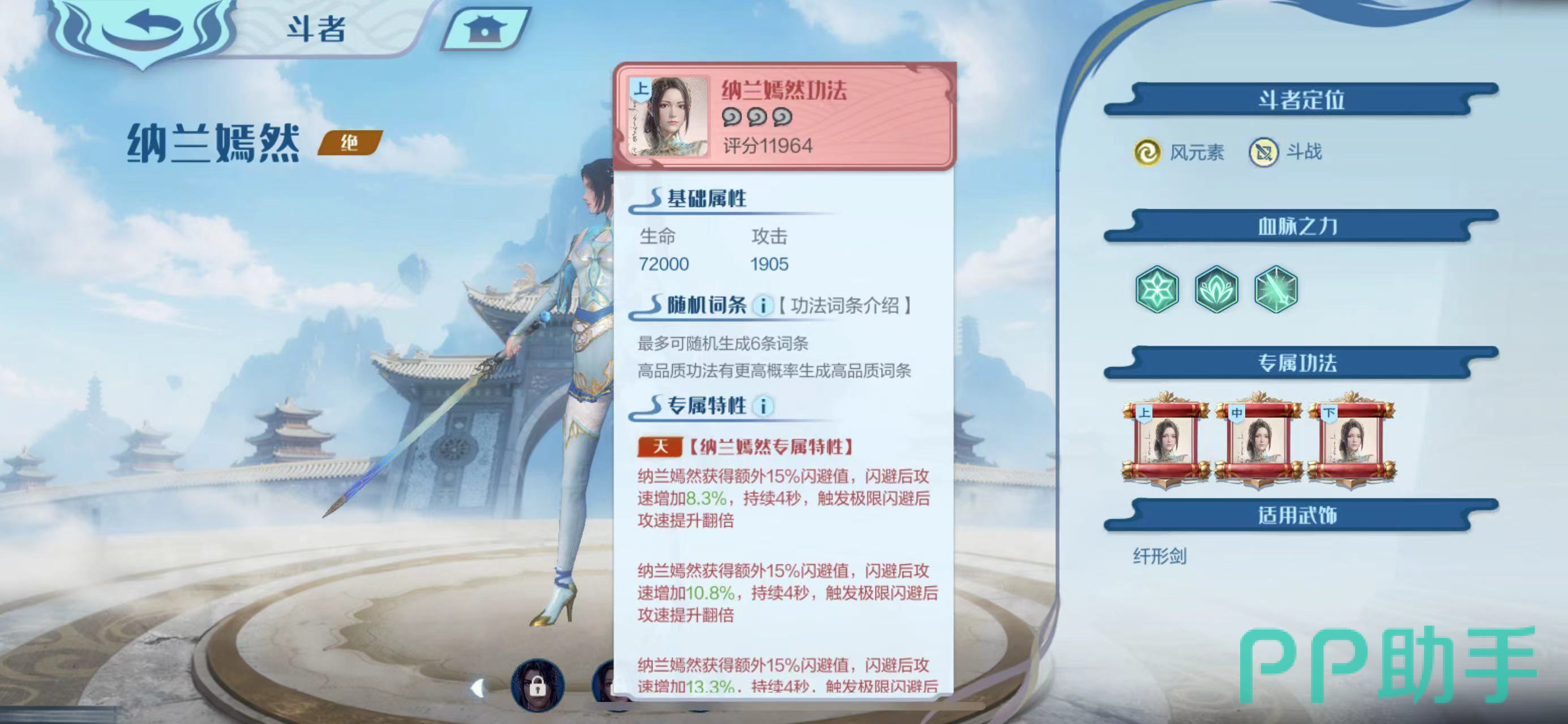 另外,纳兰嫣然的专属功法,可以让她提升大量的生命值以及攻击力。并且可以随机洗出六种词条,属性大家可以尽量的洗出攻击力、暴击率以及攻速等增加输出的词条。然后还可以带来特殊效果,可以不断地提升闪避率。当你成功闪避敌人的技能时,就能够获得高额的攻速加成,让你瞬间可以打出多发普通攻击,造成狂风骤雨般的高额伤害。