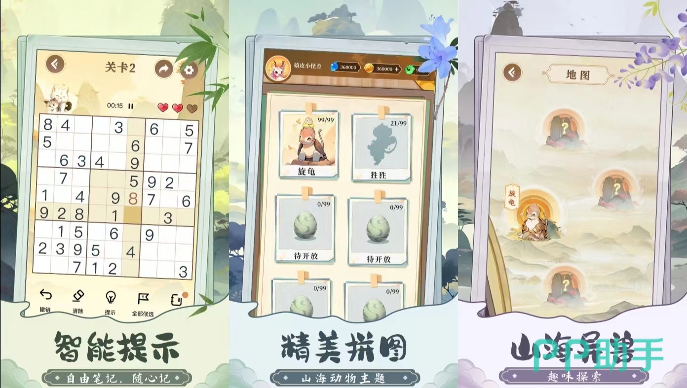 《趣味数独》游戏里面把数独和拼图的内容进行了整合,通过这两种共同来锻炼玩家的脑力,游戏里面的拼图都是一些山海经中的怪兽形象,数独的规模可以有三种不同的选择,游戏目前有500多关不同的关卡。游戏的界面中玩家可以用撤销或者是消除,也有提示的道具给玩家提供,玩家可以进行无限制的撤销,在排行榜中也能看到其他成员的排名。
