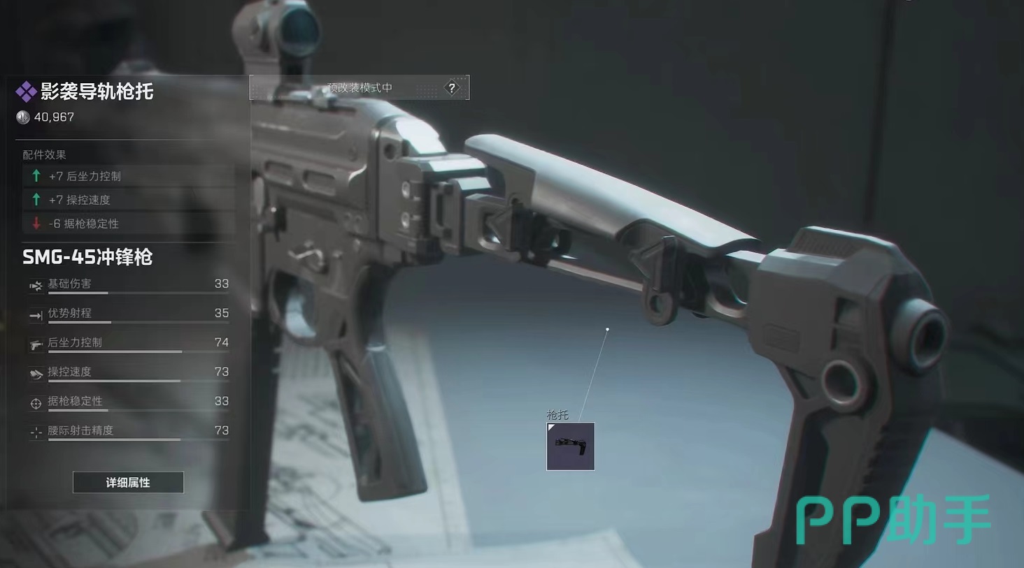 首先枪口使用rcx实用消音器,枪管使用smg45实用短枪管,右导轨使用实用枪灯,前握把使用幻影垂直握把,枪托使用影袭导轨枪托。最后是在添加瞄准镜的时候,所有瞄准镜中只有cobra准直式瞄准镜,不会造成后座力和操控衰减,一定要选择这一个。将这些全部搞定完成之后,整把枪械也就满足大家提交任务的要求了,其他配件都无需再加装,直接提交就可以了。