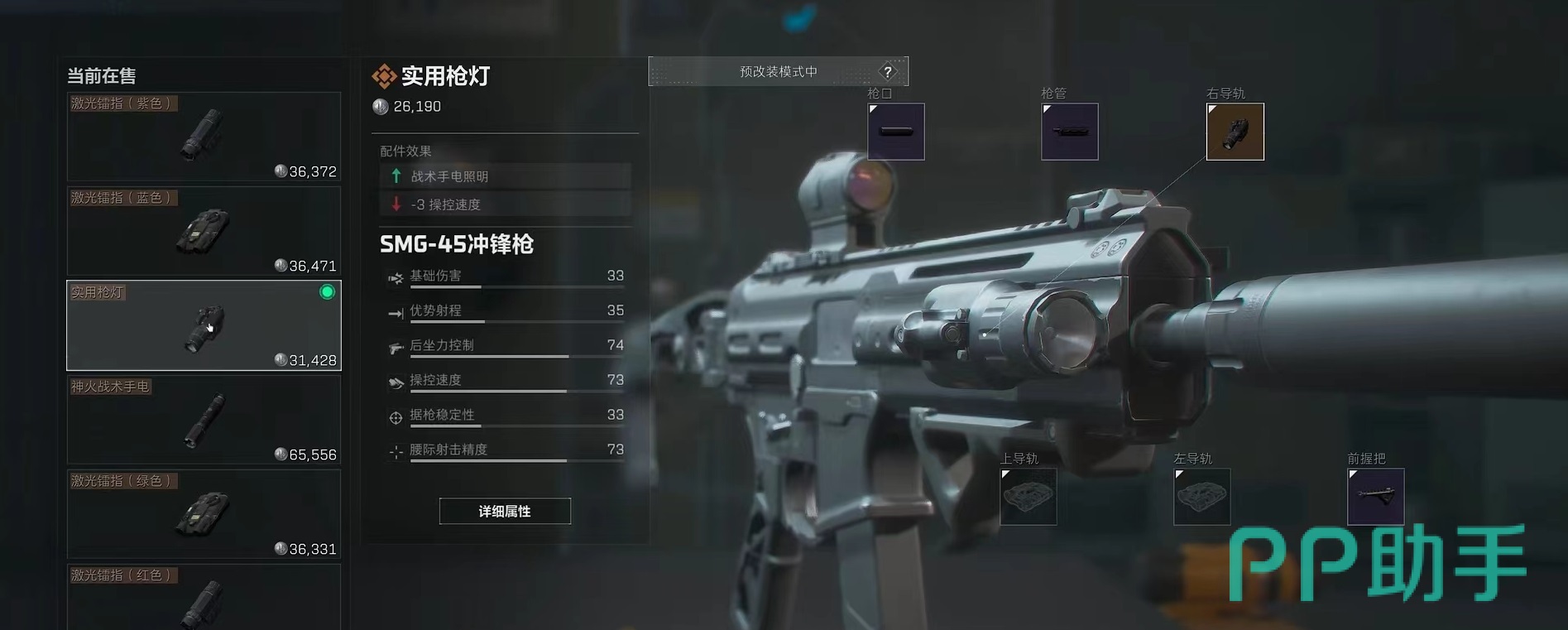 第1个是枪械要加装消音器,第2个是要加装手电筒,第3个是要有任意瞄准镜。这些条件综合在一起,对玩家来说就比较困难了。因为枪械改装有自己固有的规则,无论增加哪一项,都会导致后座力和操控的衰减。接下来小编将自己改装的配件直接介绍给大家,按照这样的模式操作就可以。整体下来没有多余的配件,在属性数值方面控制的也比较好,可以说实现了以较低价格完成要求。