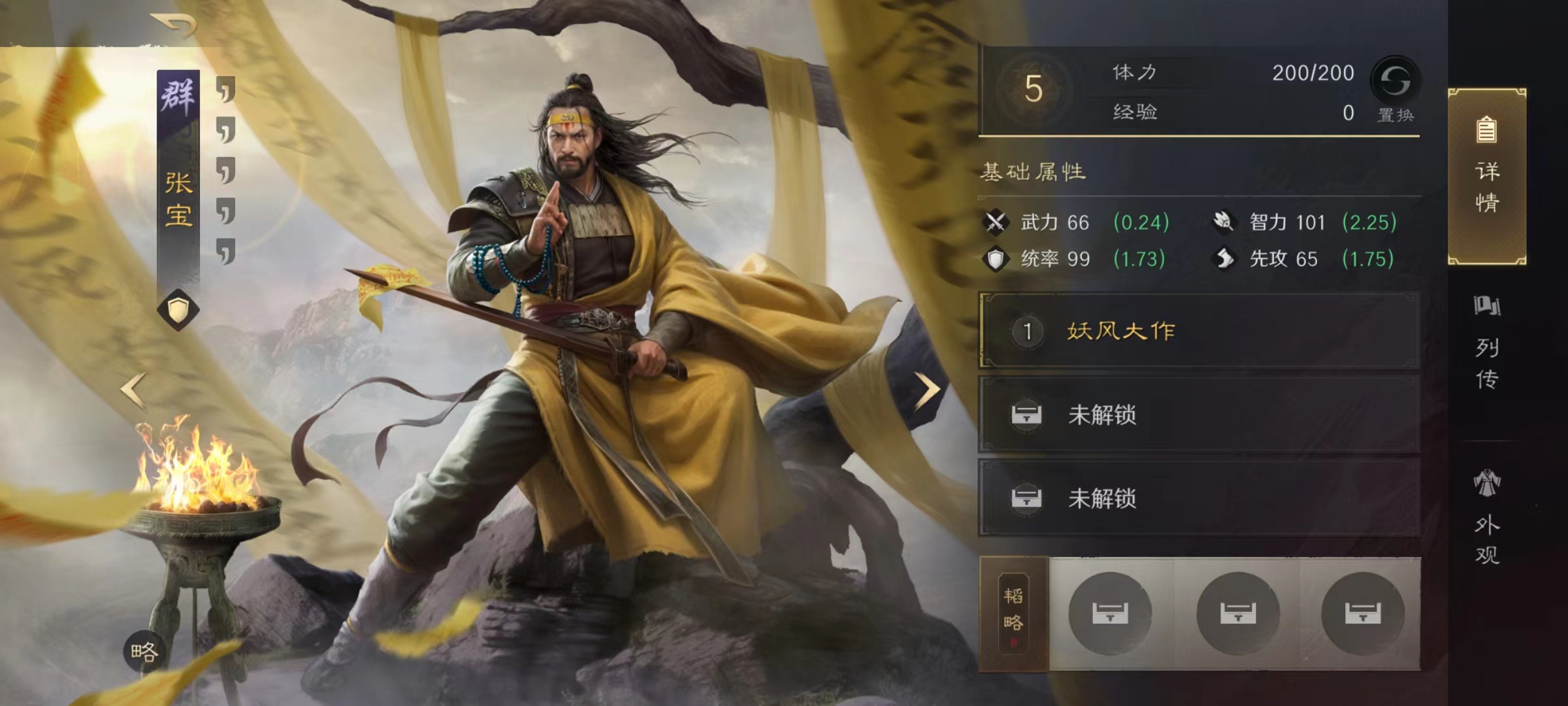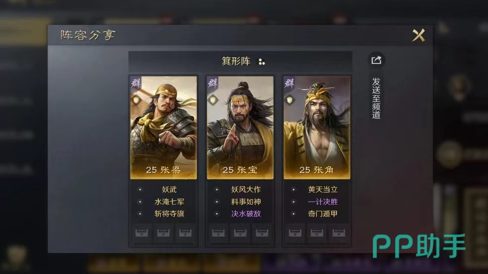 这里所说的三宝阵容搭配,其实指的就是群雄中的黄巾军三人组,分别是张角、张良和张宝,这三兄弟搭配在一起效果极其强大。整个阵容以异常状态和控制为主要核心,虽然没有明显的强势输出,但是胜在稳定和适用广泛。依靠的就是张宝和张梁技能进行控制,张角优势在于战法可以附加一定的几率,直接跳过本回合准备阶段,这样可以发挥出更多战法输出威力,提前释放一些大威力战法,令对方防不胜防。