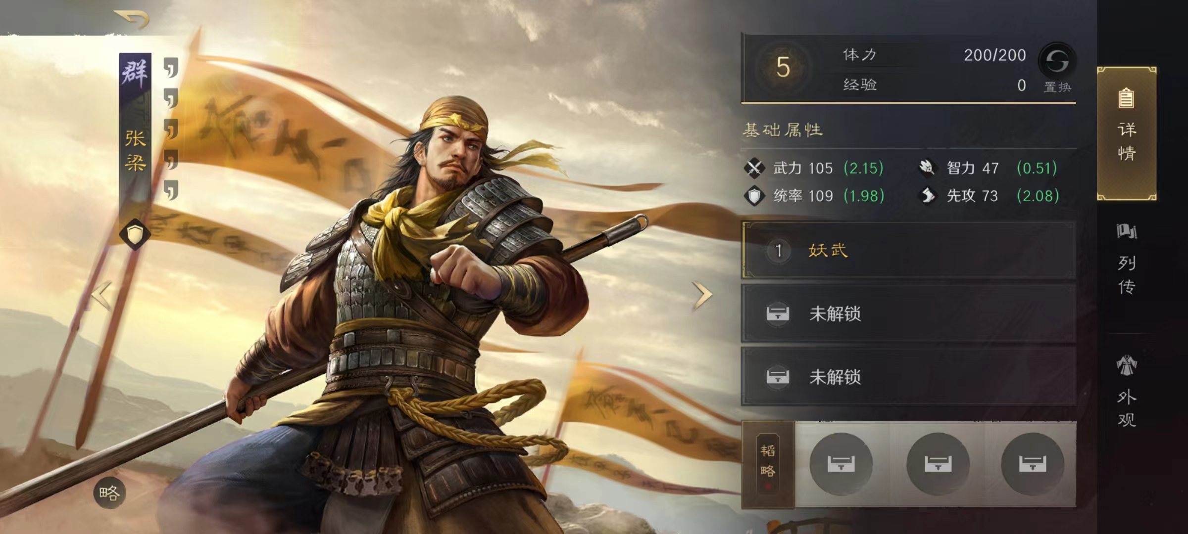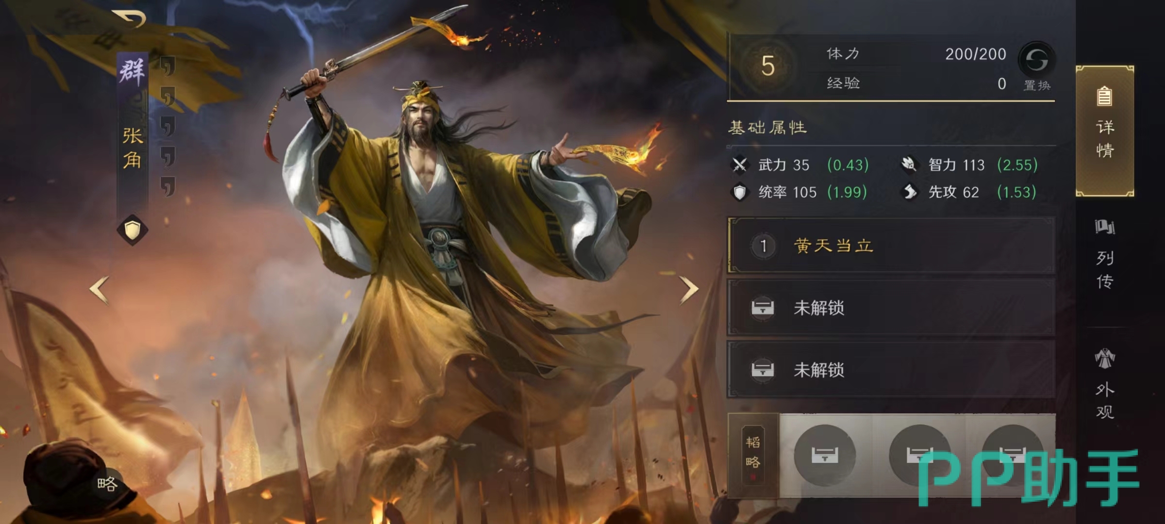 选择好角色之后,接下来就是阵容组合,张梁作为队伍前排用于提升伤害,如果在前期没有抽到张梁,也可以先用张曼城来替代,张曼城也很适合这一套三宝阵容。但张角和张宝必须具备,尤其是张角,作为整个队伍核心输出,除了拥有自身黄天当地之外,还要选择奇门遁甲等强势战法,这些都是不可缺少的。阵容搭配思路就是以爆发和控制为主,在前期开荒打地时候,只需要几个回合就可以快速结束战斗,是目前非常优秀的开荒配队选项。