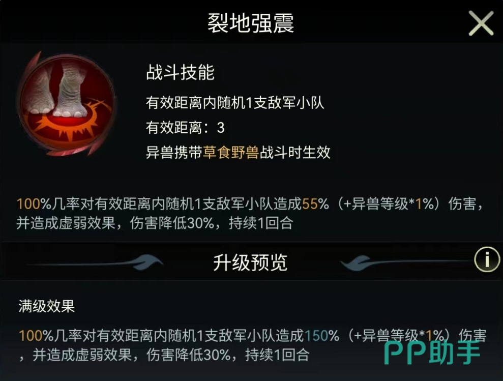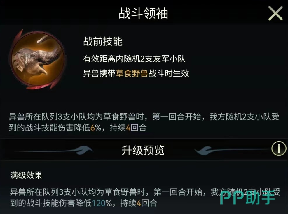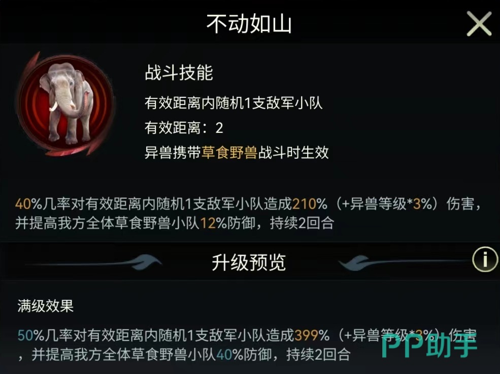最后介绍的是印度象的三个独特技能,可以在战斗中生效,分别是裂地强震,不动如山和战斗领袖。裂地强震攻击距离为三格,有100%几率对随机一支敌方小队造成伤害,并使其陷入到虚弱状态。被虚弱之后,一个回合内输出的伤害降低30%。伤害比较一般,但是造成的虚弱可以限制对方输出。不动如山有效距离两格,有50%几率对随机目标释放,造成一次较高的伤害,并提高我高全体草食野兽40%防御属性,持续两个回合。最后的战斗领袖也是对草食类野兽生效,会随机选择两个目标降低受到的伤害。