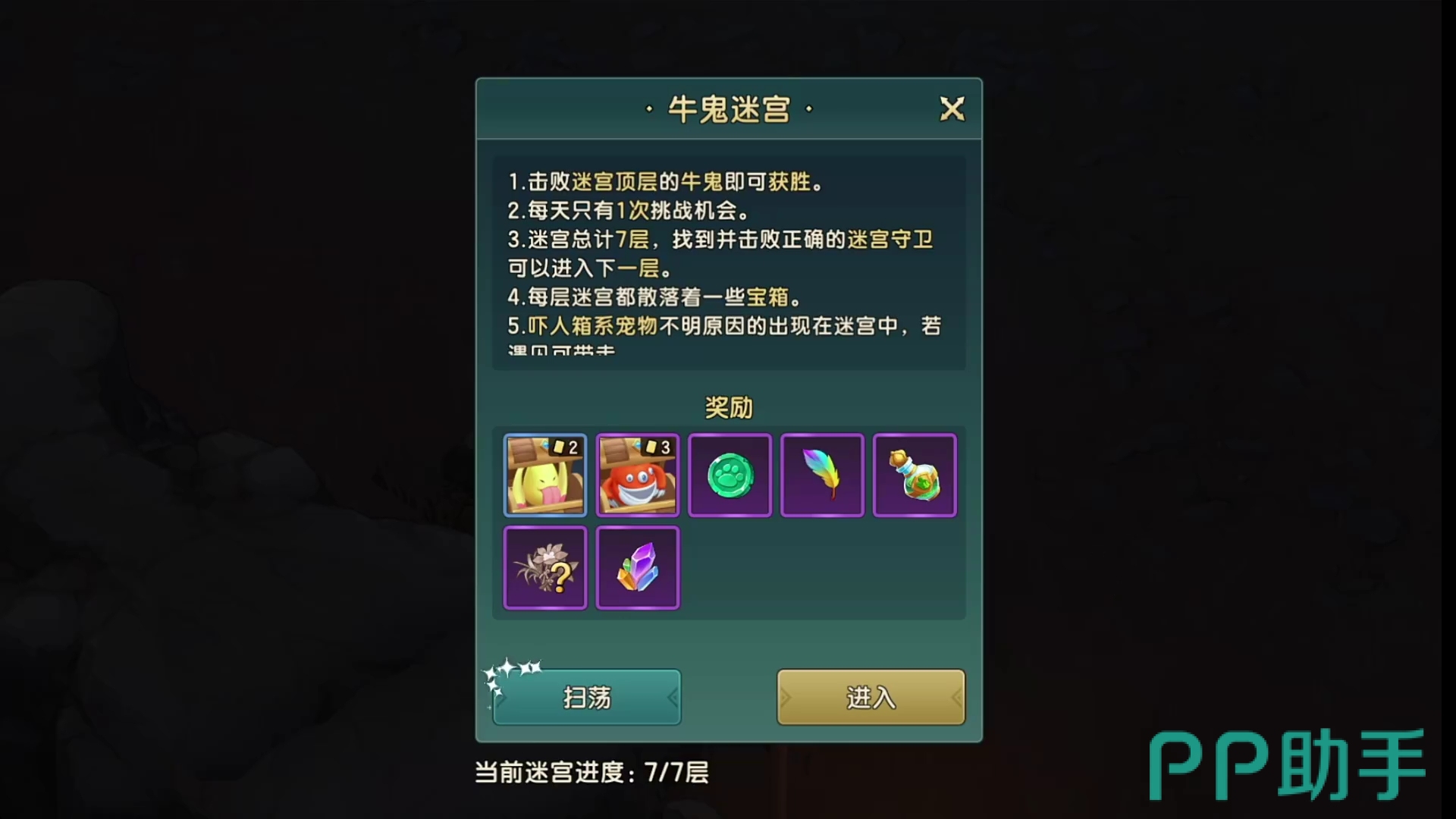 玩家在等级升到26级之后才能解锁牛鬼迷宫,牛鬼迷宫一共是有7层,每一层有一个守护者,除了守护者还会有一些箱系宠物出现,因此你需要找到正确的守护者,玩家需要一层一层去闯,只能打败每层的守护者才能解锁下一层,牛鬼正是在迷宫的最顶层,只要击败它就可以获胜,每天有一次挑战的机会。