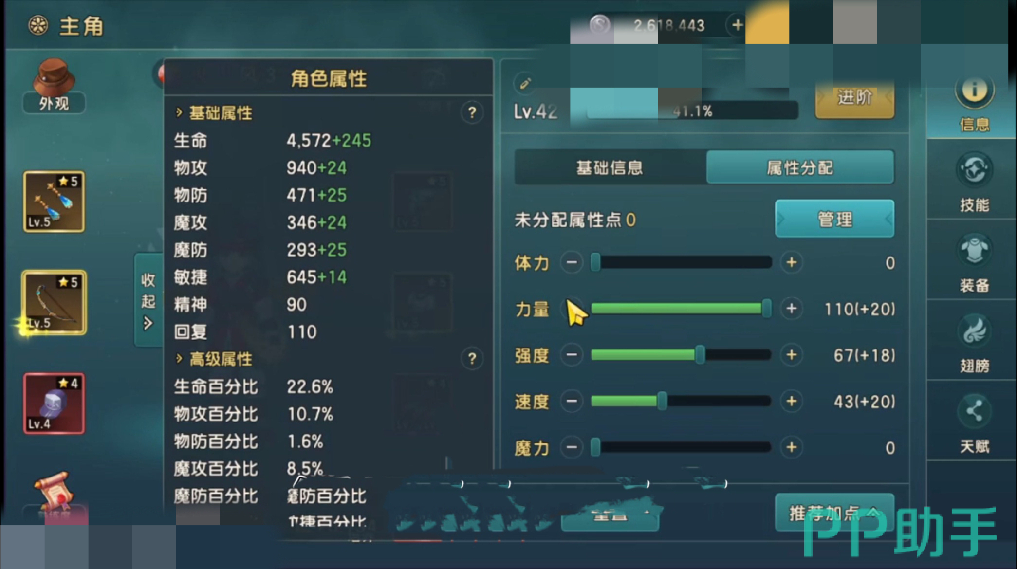 那么在角色加点方面,一共是有五种属性点,分别是体力、力量、强度、速度和魔力,在加点时玩家可以根据各自的角色的职业来进行加点,一般来说只要是输出的职业,比如弓箭手职业力量肯定是要点满的,魔法师就是魔力肯定是要点满的,剩下的点可以考虑加一半的体力或强度,剩下的一半去点速度,甚至你想更暴力一点魔法师可以直接全魔力全强度拉满。