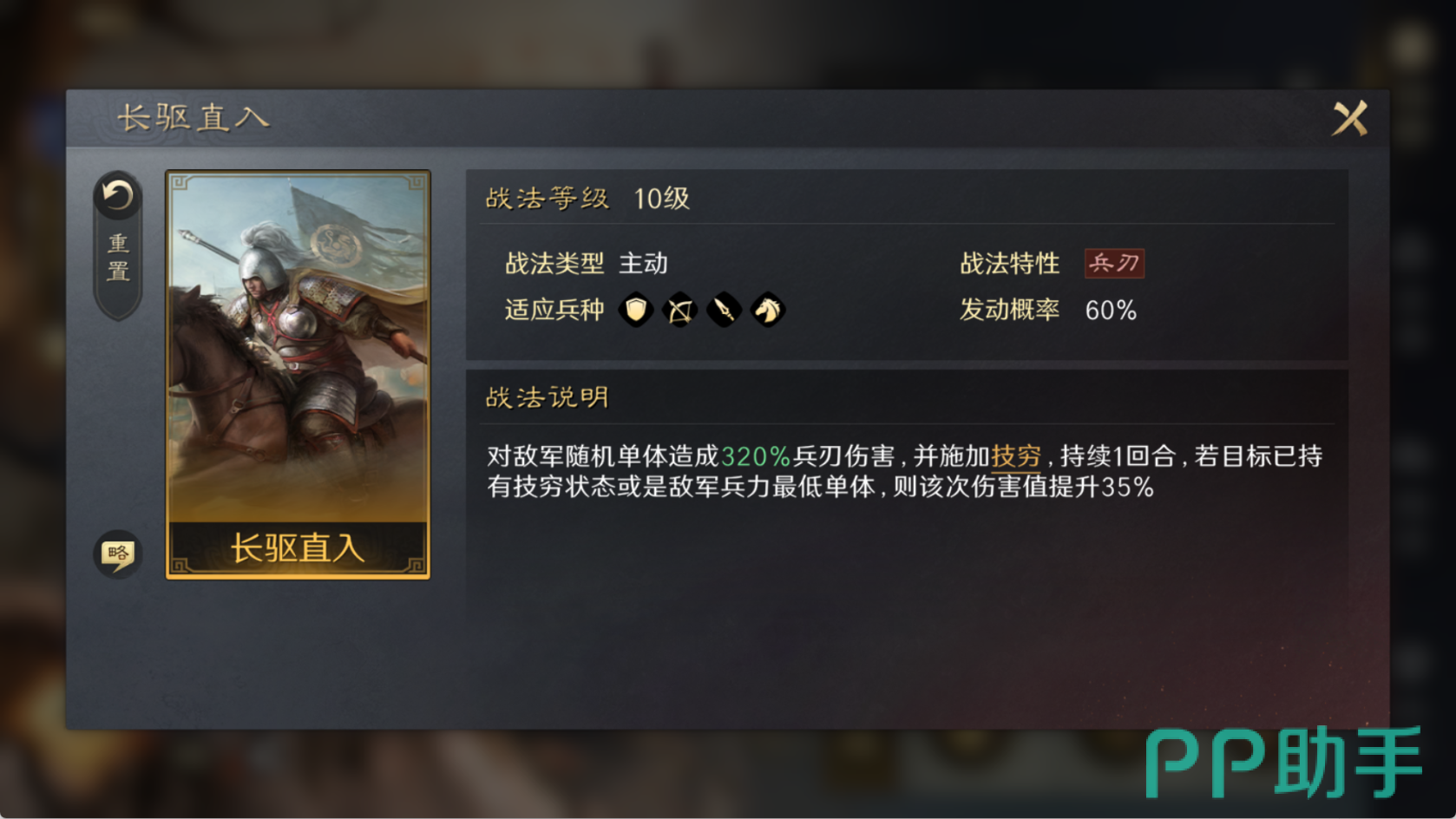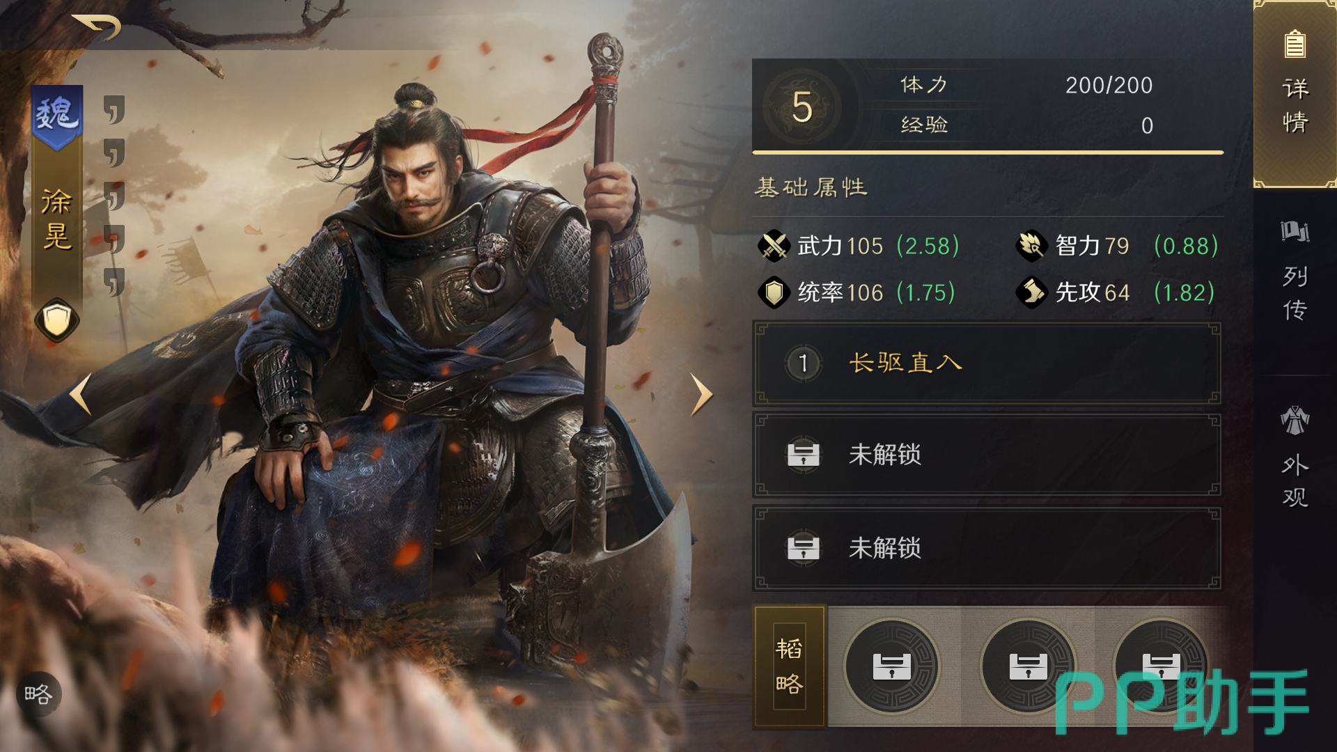 三国谋定天下这款手游中的徐晃,斩将夺旗阵法使用出来可以增强你们的先攻几率,它本身带有一定的机动性,作为突袭类型的武将,搭配上长驱直入的战法,可以给敌方造成大量的伤害,但是它的缺点就在于自身谋略和防御方面的不足,因此玩家们最好搭配上一些奇佐职业的角色。