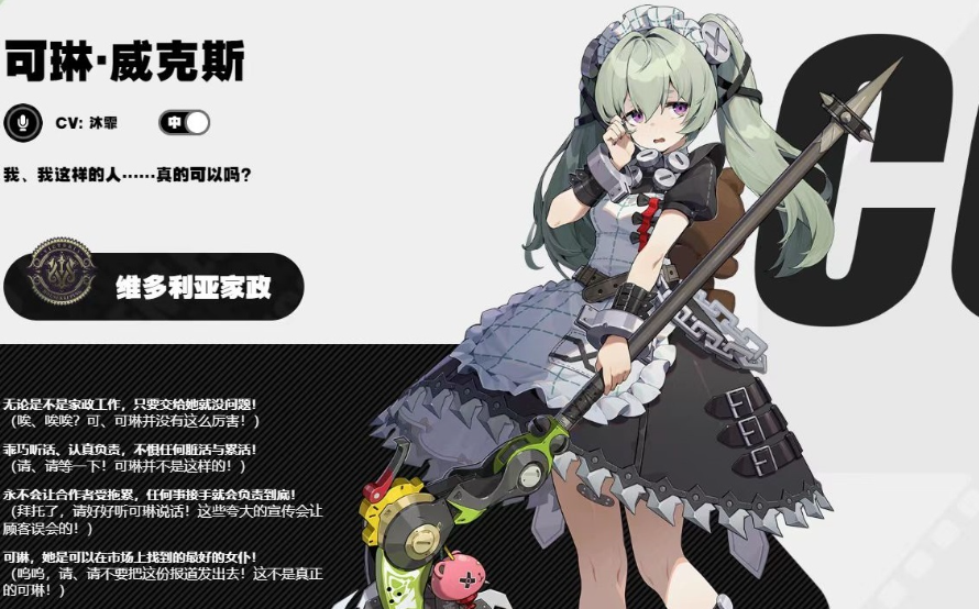 6、【可琳:威克斯】属于维多利亚家政公司的成员,武器是电锯,性格较为自卑。可爱软糯的外表下隐藏的是超强的实力,相互矛盾的元素在来矛盾的可爱感。