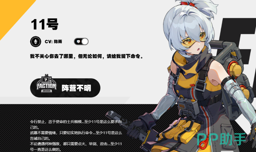 4、【11号】只知道执行命令的士兵人形兵器,立场不明但是拥有超高的战斗力,对人类的认知有障碍也不知道如何表达情感。