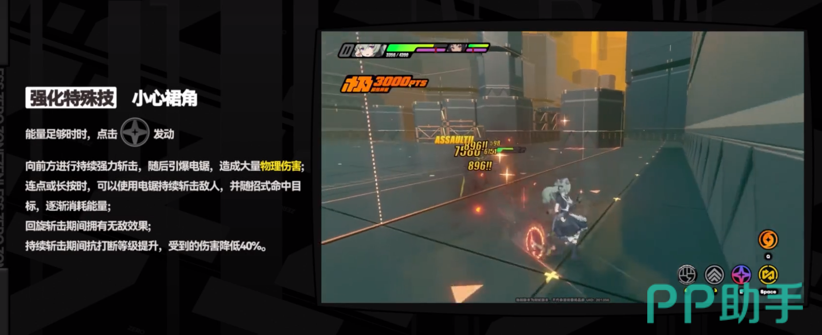 【 强力清扫】特殊技能,让角色向前方进行攻击的时候引爆电锯造成额外的物理伤害。在释放这个技能的同时可灵的抗倒性提高能够弱化受到的伤害,减少50%~80%的伤害生存率提高。强化技能【 小心裙角】,同样能对敌人造成物理伤害。