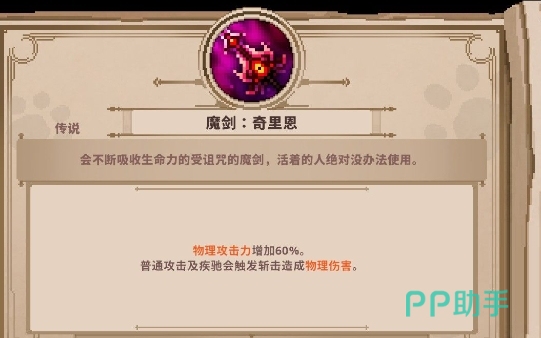 魔剑奇里恩优化了物攻,并在一般进攻中触发斩击,造成了额外物攻。魔剑奇里恩是一种很强大的输出装备,能够显著提升玩家的攻击力。进攻效果在高攻击速度下更加明显,因此与恶魔狂战士头骨的增加攻速效果相辅相成。使用魔剑奇里恩的高物理攻击力和额外伤害效果,能够快速击败对手。