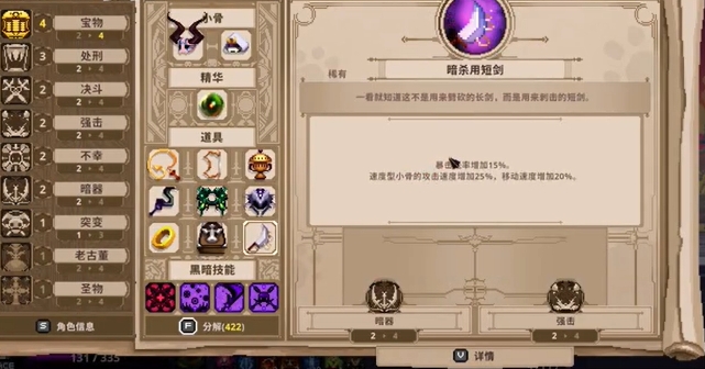 暗杀用短剑增加暴击概率,并提高速度型小骨的攻速和移速。这使得玩家在战斗中不仅能够更快地攻击敌人,还能更加灵活地躲避敌人的攻击。非常适合与巨魔精华搭配使用。在巨魔精华的5秒暴击时间内,高攻速和高暴击率能够让玩家在短时间内打出巨额伤害。平时也可以利用增加的移速更灵活地进行走位和输出。