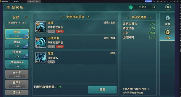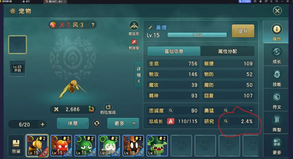 接下来可以先熟悉装备的熟练度,还有进行宠物研究,一路把等级提升到28星。在符文包这方面,建议选择物攻必杀,宠物研究方面可以选择鼠科>树精科。