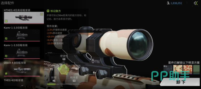 瞄具这一块机械瞄具有就装,光学瞄具用四倍镜,如果喜欢对枪可以用HTHEG4倍镜来标记敌人让对手逃无可逃。如果是主打搜刮物资,那么就直接THEG4倍镜,能透视物资。