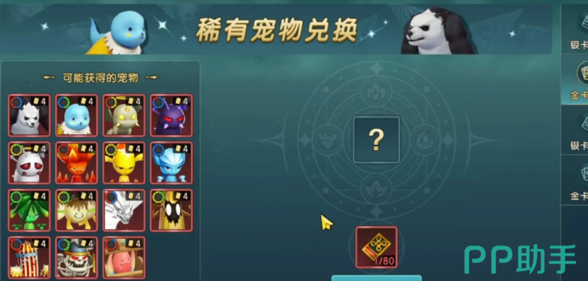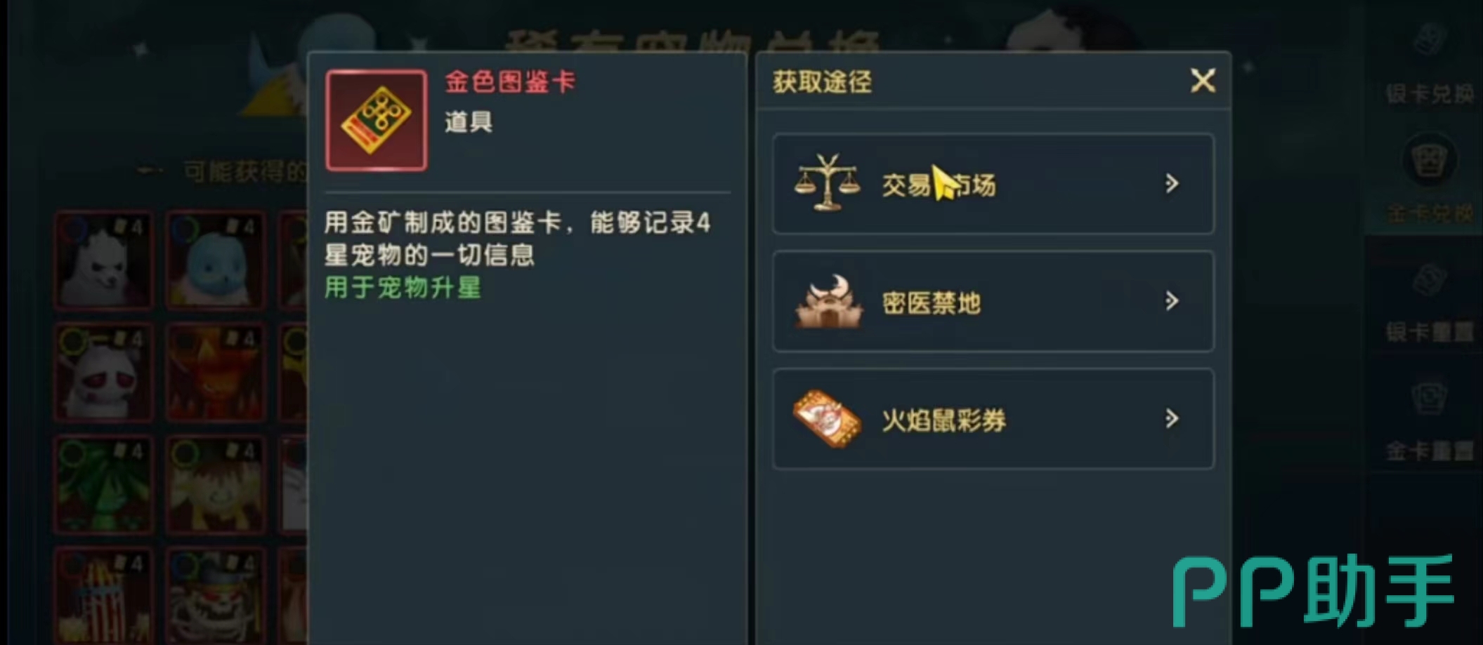 每只四星宠物都有着强大的增益,各位玩家们可以在家里的宠物使者那里去兑换宠物,分为银卡兑换和金卡兑换,银卡兑换就是三星宠物,金卡兑换的就是今天的主角四星宠物了,八十张金卡就可以随机获取一个四星宠物,金卡不足的玩家可以在交易商城里面购买,售价是五万金币一张,但是随着时间金卡的价值会慢慢增长,所以大家越早入手越好。