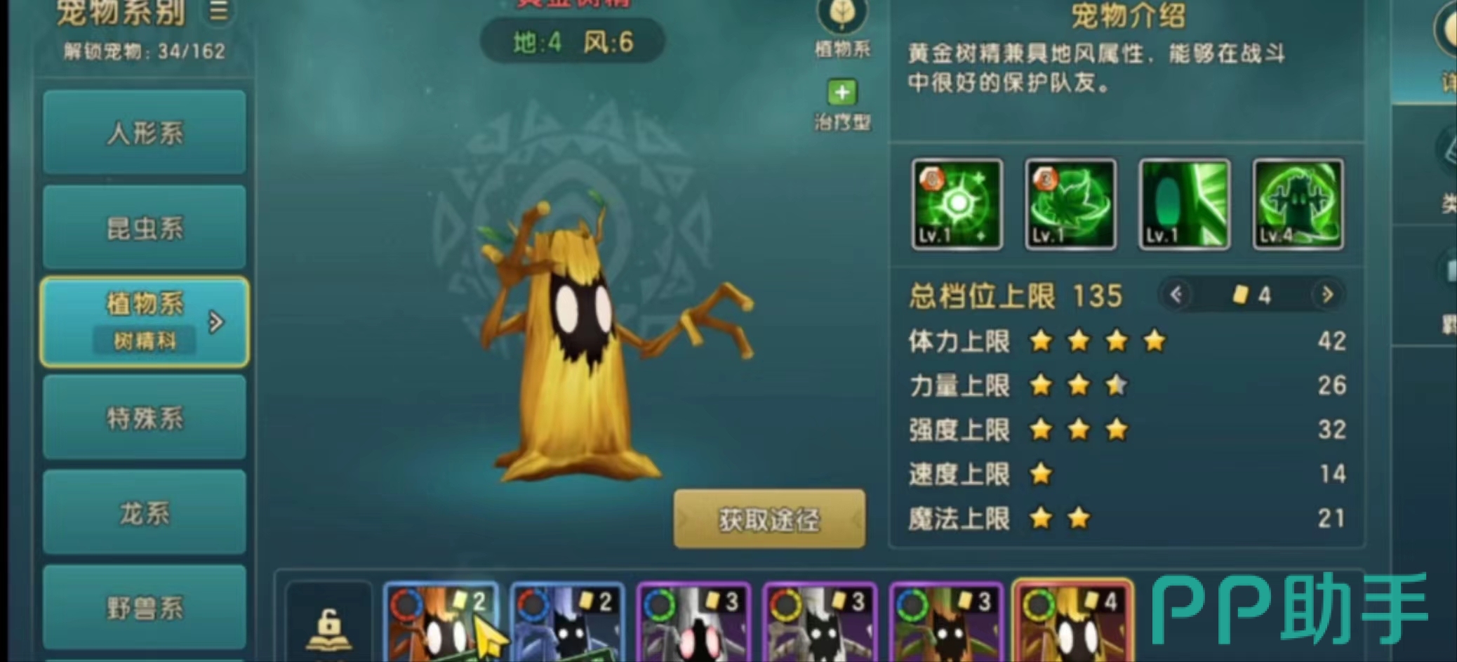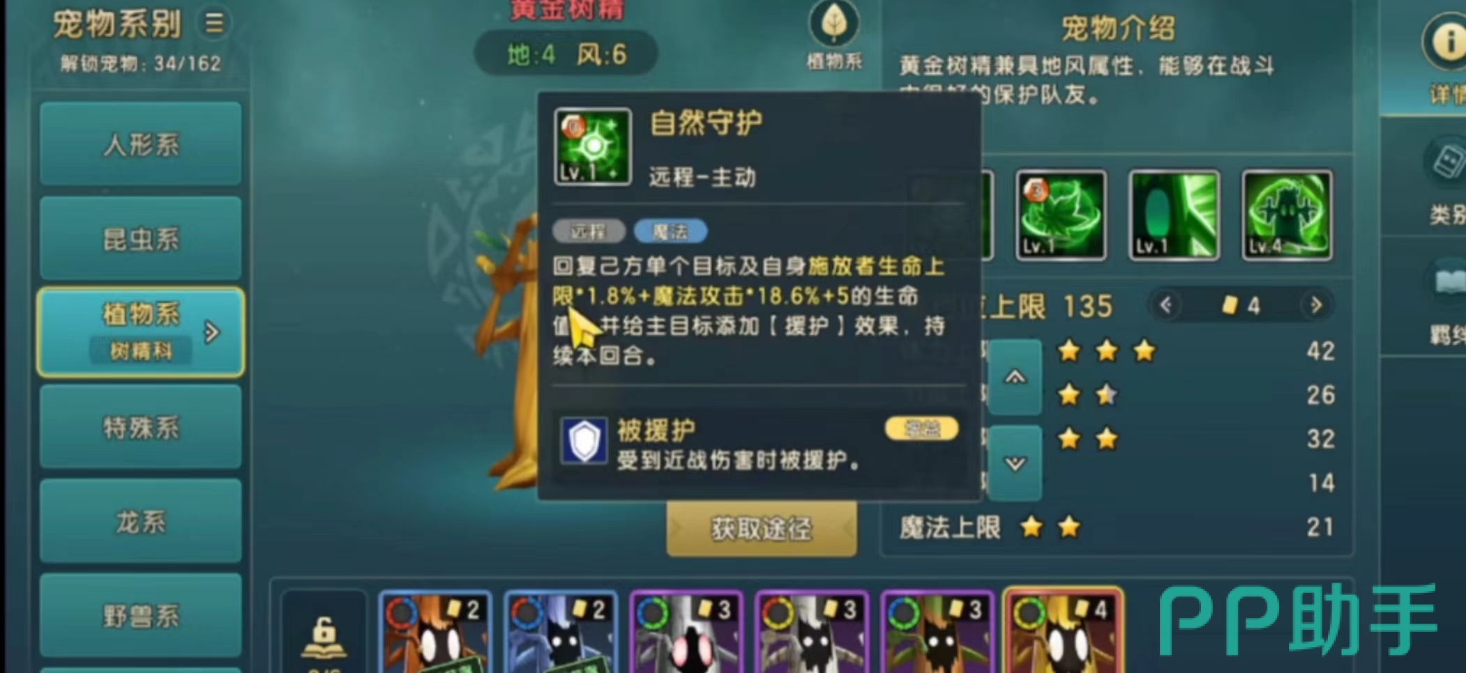 还有一个就是咱们庞大的树精科的四星宠物黄金树精了,也是一个肉盾型宠物,第一个技能跟火精灵一样,都是回血,但是它会给目标添加一个援护效果,当友方收到伤害的时候树精就是跑到他前面抵挡这次伤害,但是只持续一回合。二技能给随机两个队友回血并有几率附带治愈效果,在三回合每次行动都会回复生命值,如果已经有治愈效果的话就会直接触发三回合的治疗量,可以说治疗量非常的恐怖了。