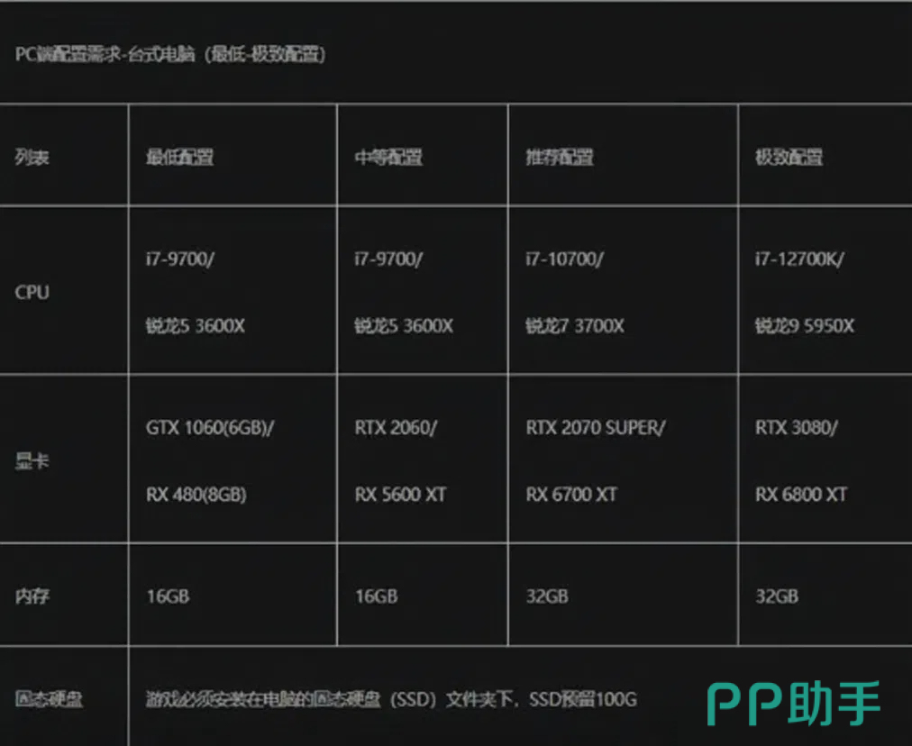 本次测试公布了四个不同的配置方案。其中,最低配置的要求为CPU要I7-9700,显卡GTX1060,内存16个G,并且需要固态硬盘100个G的预留空间。关于其他的配置,大家可以通过相关图示来详细了解。需要特别指出的是,每个PC端测试账号只能绑定一台PC设备,这一点请大家务必注意。