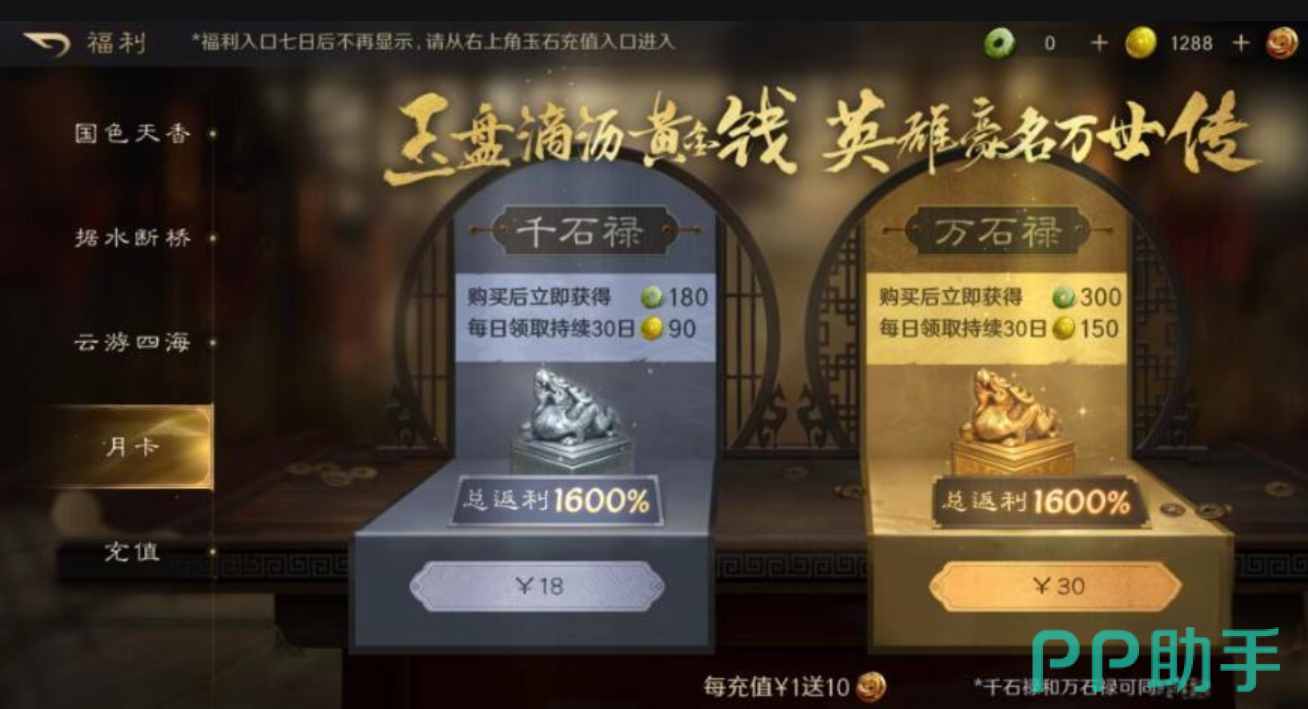 在该游戏当中,月卡其实涉及为两种。一种是18元,还有一种是30元,目前很多玩家会选择购买30元的月卡。毕竟涉及到的金额不一样,性价比也会有所不同。一般玩家购买了月卡之后就会获得玉石和黄金,除此以外,玩家还会获得开荒武将大乔。