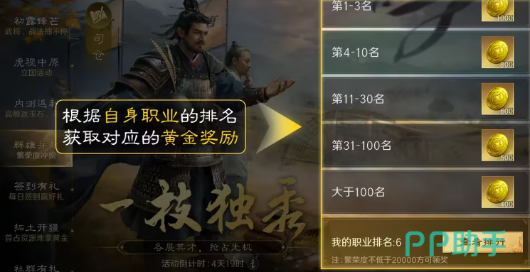 该活动会在每一个赛季的前一周进行开启,其实玩家们可以理解为帮战活动占据活动中需要攻打的地界根据玩家的贡献和数值安排相应的官职,获得对应官职的奖励。奖励是游戏货币和抽卡道具。【群雄并起】,排名活动会在每一个赛季刷新,对应的职业参加排行获得排名奖励。