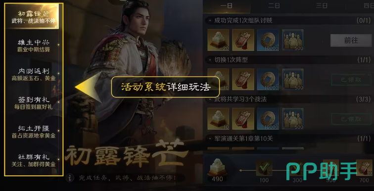 【初露锋芒】,一个每日刷新的活动,其实玩家们可以理解为一个活跃宝箱,在玩家完成相关的日常任务的时候获取到货币、道具和经验等资源。每一天刷新获取到的物资会进行改变哦!【虎视中原】,同盟战斗活动。