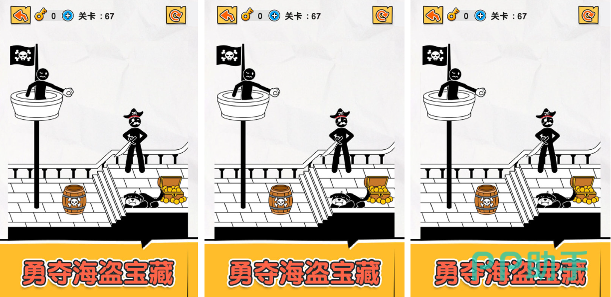 橡皮火柴人是款挺有创意的竖屏操作火柴人主题休闲益智游戏,玩家要扮演火柴人海盗在不同关卡中获取不同的物品和宝藏,游戏内每个关卡都包含着一种非常烧脑的谜题,想要顺利拿到宝藏就要快速解开谜题的答案,独特的休闲解谜玩法对大家的智力和记忆力都是一种锻炼,简单的操作体系和简约的场景塑造也相得益彰。