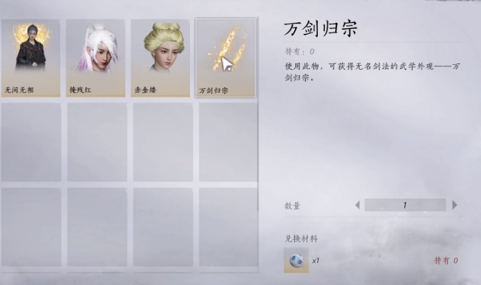 万剑归宗是无名剑法的外观,装上后无名剑法在施展时会呈现出相应的特效,例如蓄力时会在玩家头上凝结出几把金色的飞剑,角色行动或不动时手臂上会出现金色的亮光等。而玩家要想将它拿到手,只能通过大音希声卡池抽出八音窍,然后在和鸣商店中将万剑归宗这款武学外观给兑换出来。
