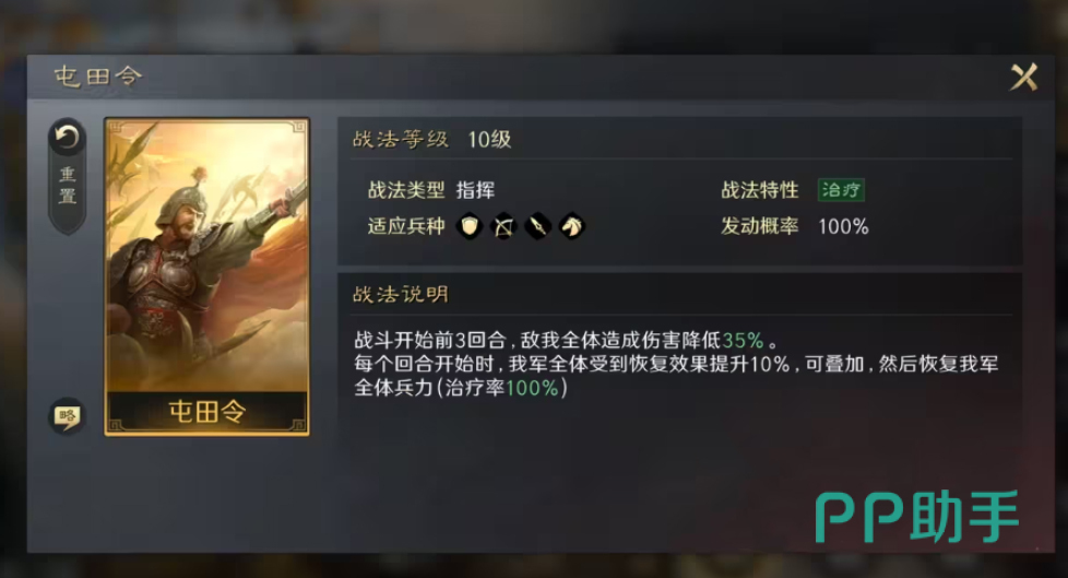 另外该英雄自带的战法叫做屯田令,释放时可以让人全体兵营的恢复效果提升。并且这种恢复能力还能够不断叠加,可以增强一个队伍的持续作战能力。如果对方的伤害越高的话,那这种回复能力就越强,另外还可以降低对方造成的伤害。