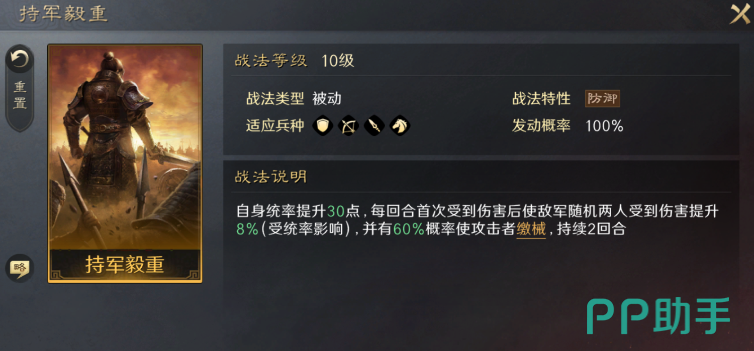另外,他自带战法—持军毅重。这是一个被动技能,使用之后可以提升自身的统帅值。并且若是受到别人的伤害时,将使敌军随机两个人受到的伤害提升至更高。还有60%的概率,让对方无法继续攻击,持续两个回合。这是一个很强的辅助技能,能够保护好你的后排,避免受到更多的伤害。
