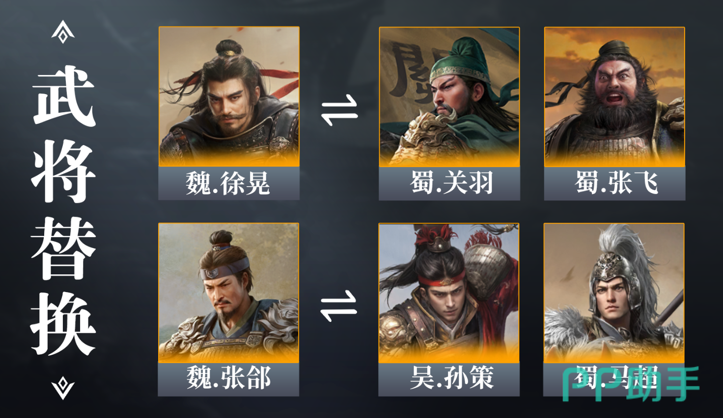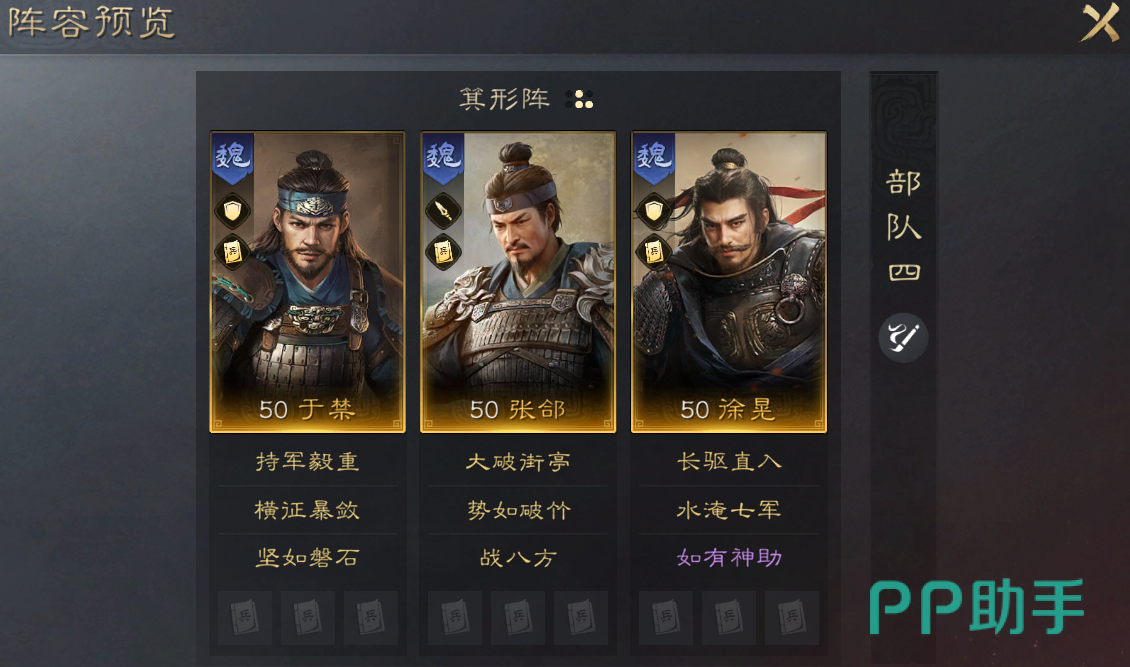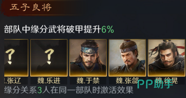 由于他是魏国阵营的武将,所以推荐搭配四个同样是魏国阵营的角色。例如张辽,这样将提升所有人的破甲效果。也算是变相的增加了整个阵容的输出能力,如果没有张辽的话,也可以替换成孙策等角色。