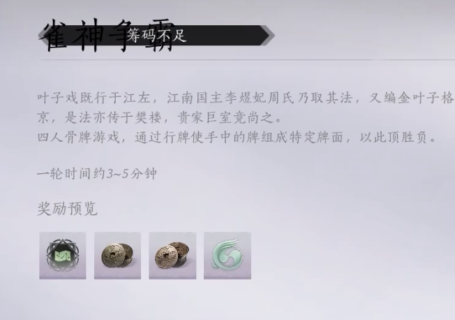 当你成功赢下麻将比赛之后,那就可以获得该模式的奖励。例如大量的经验值以及铜币,还有其他若干道具。所以对于想要刷取材料的朋友,但是又不想刷怪的话。就可以体验一把休闲又有趣的雀神争霸赛。
