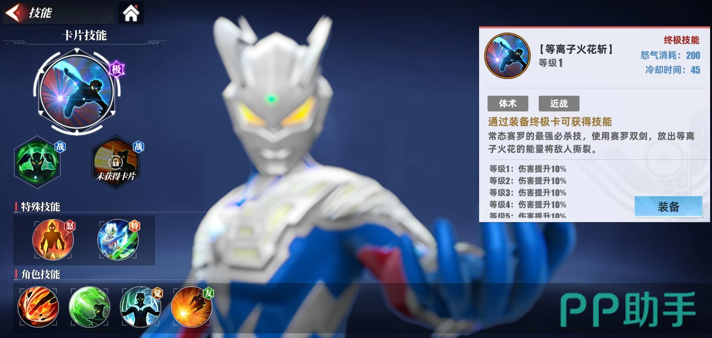 另外还拥有两个特殊技能,分别是怒气技能爆气,立即恢复站立状态,并将周围敌人击退,在接下来15秒内攻速和移动速度增加,暴击增加。提升等级之后还有其他效果,例如对周围敌人造成硬直,立即将普通攻击重置等效果。第2个夜幕特训,每天夜间可以补充体力数值。接下来是三个卡片技能,大招作为赛罗最强必杀技,使用赛罗双剑,放出等离子火花将敌人撕裂,该技能伤害极高,用于终结对方使用。第2个赛罗头标,将头标发射出去,命中敌人后产生弹射效果。第3个赛罗集束射线,双手组成L姿态,从右臂发射强力光线。
