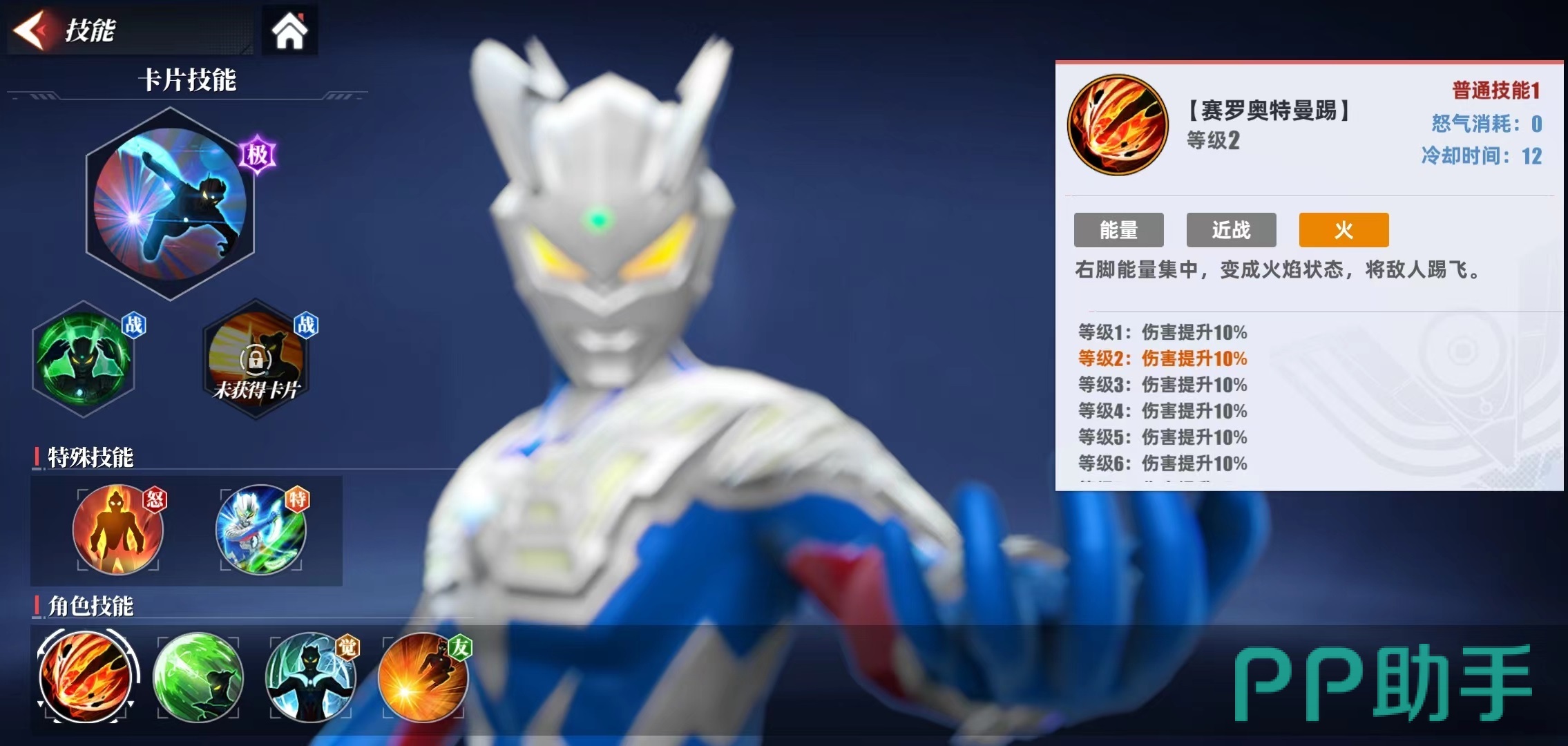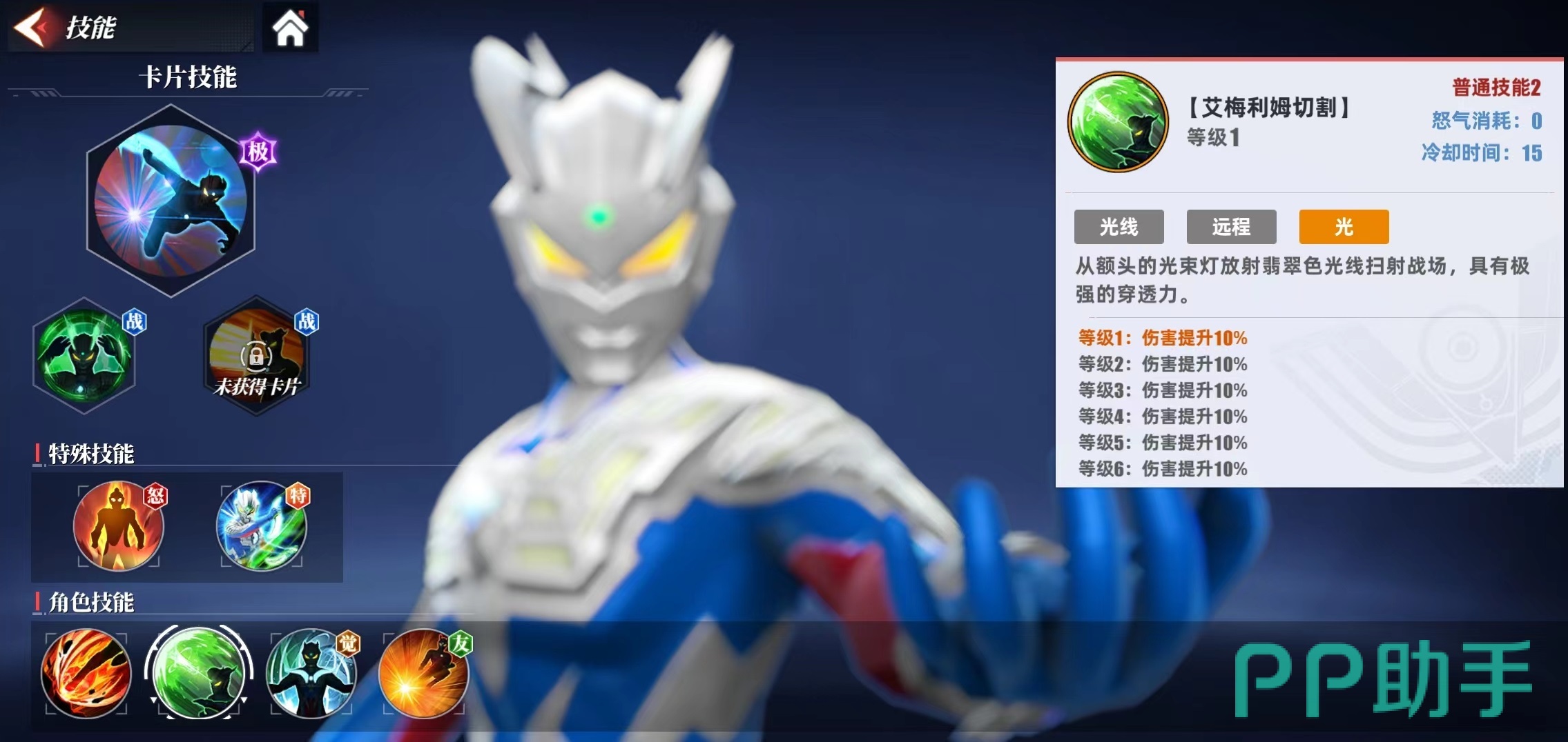 先来看一下普通技能,第1个技能使用后右脚能量集中变成火焰状态,将人踢飞。第2个艾梅利姆切割,利用额头上的灯发射出威力巨大的光线横扫战场,拥有极强穿透能力。觉醒技能使用后,利用头标将光刃能量转化为光线,技能伤害范围广,数值高。还拥有友情技能赛罗飞踢,同样是利用右脚力量将对手踢飞。
