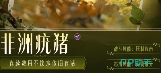 非洲疣猪有着充沛的精力,也有着强壮的身体,具有战斗技能也有指挥技能,战斗技能为压制攻击控制对手的同时,还能够对对方造成攻击指挥技能为尖锐獠牙,具有统领整个团队的作用,非洲疣猪有一个特性,连续数月不饮水生活。