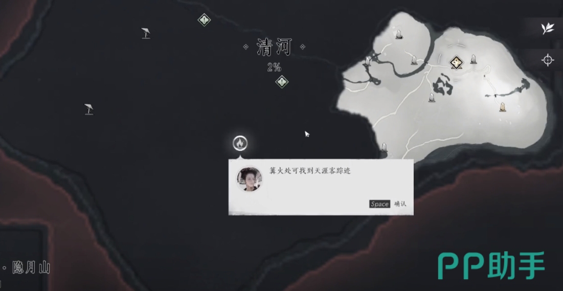 在这个区域中,会有一个名叫天涯客的npc坐在篝火边。玩家找到他以后可以和他进行对话,然后他会给玩家一份天下舆图。这样玩家就能解锁这片区域的地图了。解锁地图后,玩家打开地图,看到的也不再是灰色区域了。